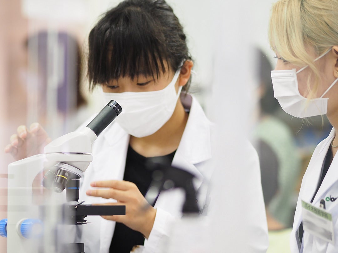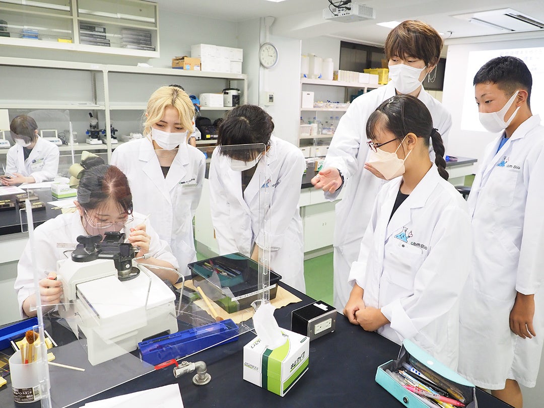 参加したこどもたちは、細胞の成り立ちや特徴を学んでから、obmバイオ学科・バイオ技術学科の在校生の実験操作サポートのもと、細胞の染色や組織細胞の標本作製、顕微鏡での観察などにチャレンジしました。ラボツアーでは、細胞培養や分析に用いられる各種機材がそろう実験室のほか、バイオ受託研究機関OBMリサーチセンターの内部も見学しました。