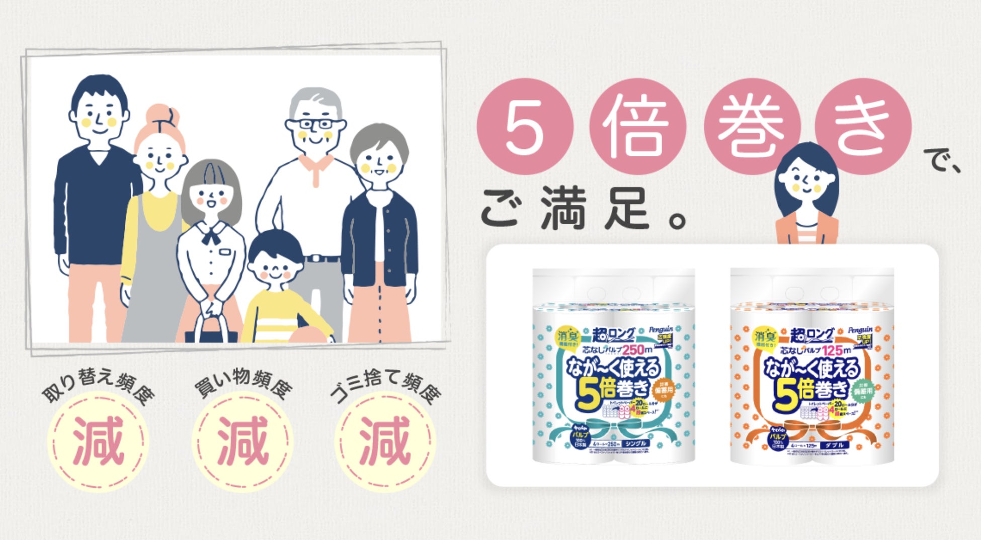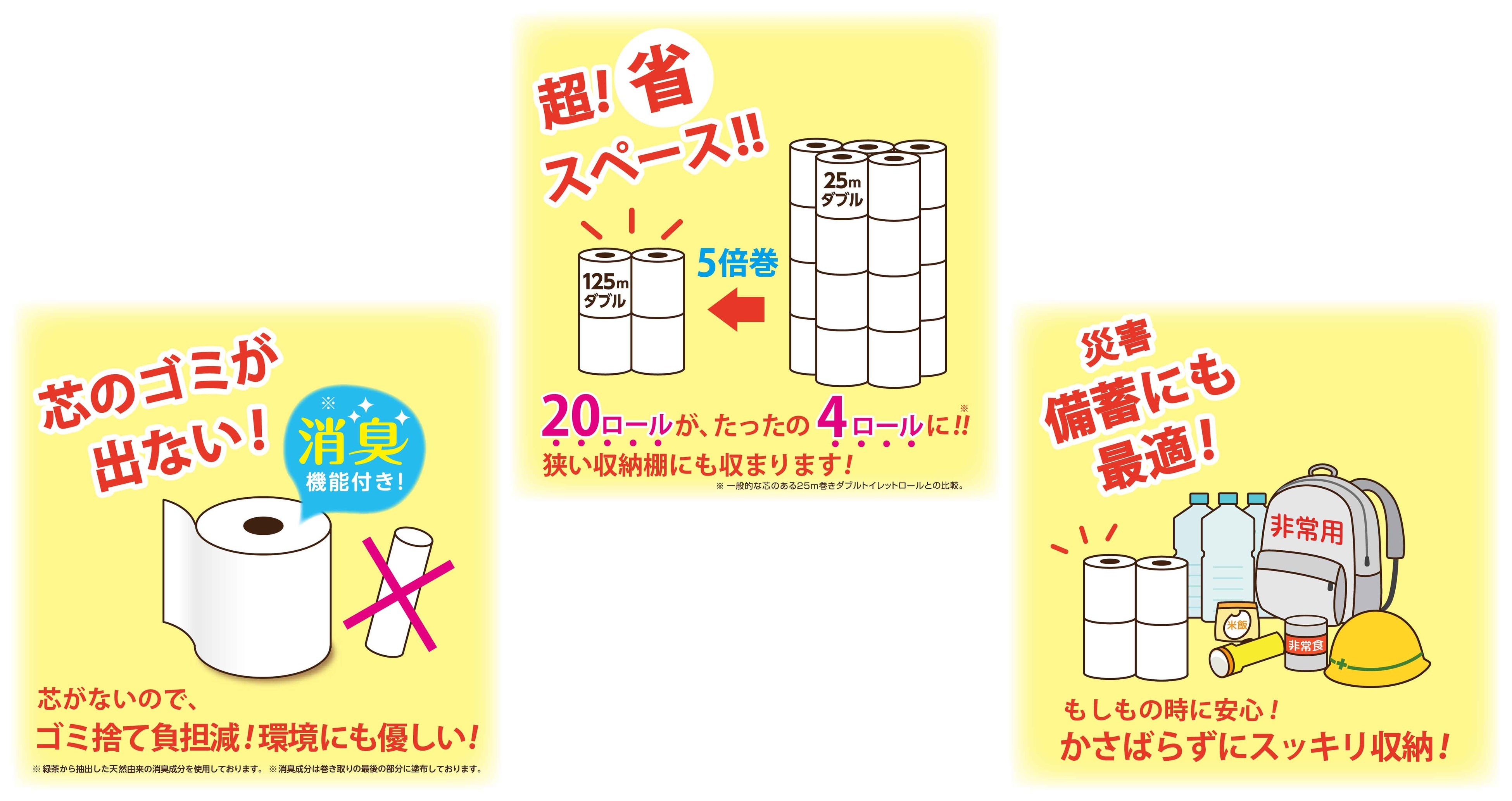 超ロング125mダブルは、一般的な芯のあるトイレットペーパー25mダブルと比較し、5倍長く、取り替え頻度が大幅に減らせ、ご満足いただける商品です。