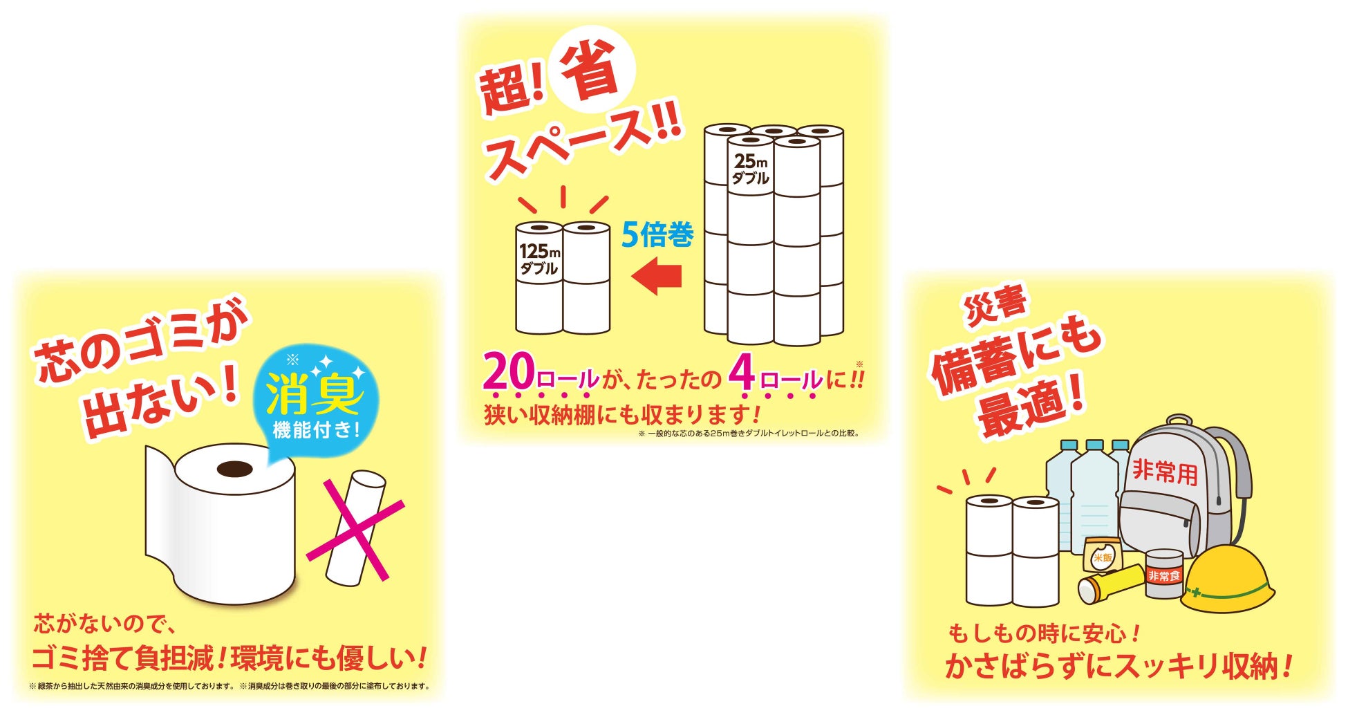 通常20ロールがたった4ロールのボリュームに収まるため、保管スペースに余裕が生まれます。