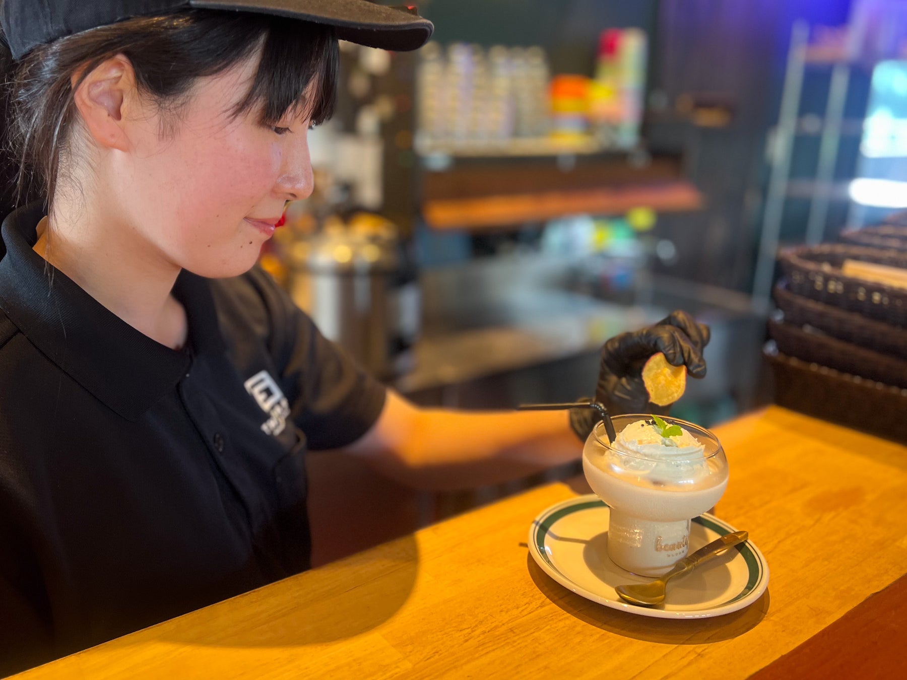 ベースのラテについてはミルクの分量以上にふんだんに芋を使いなめらかに、濃くそしてサッパリと仕上げました。より芋の甘味を強調するためほんの少々の黒糖を隠し味にしています。そこに芋の風味を凝縮したクリームを乗せ、香ばしく揚げたさつまいもチップと、アクセントのミントで飾り付けています。