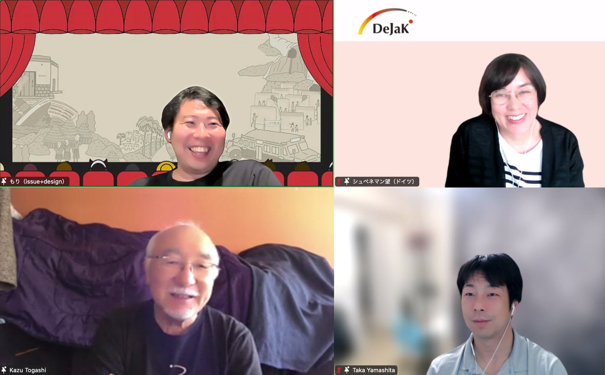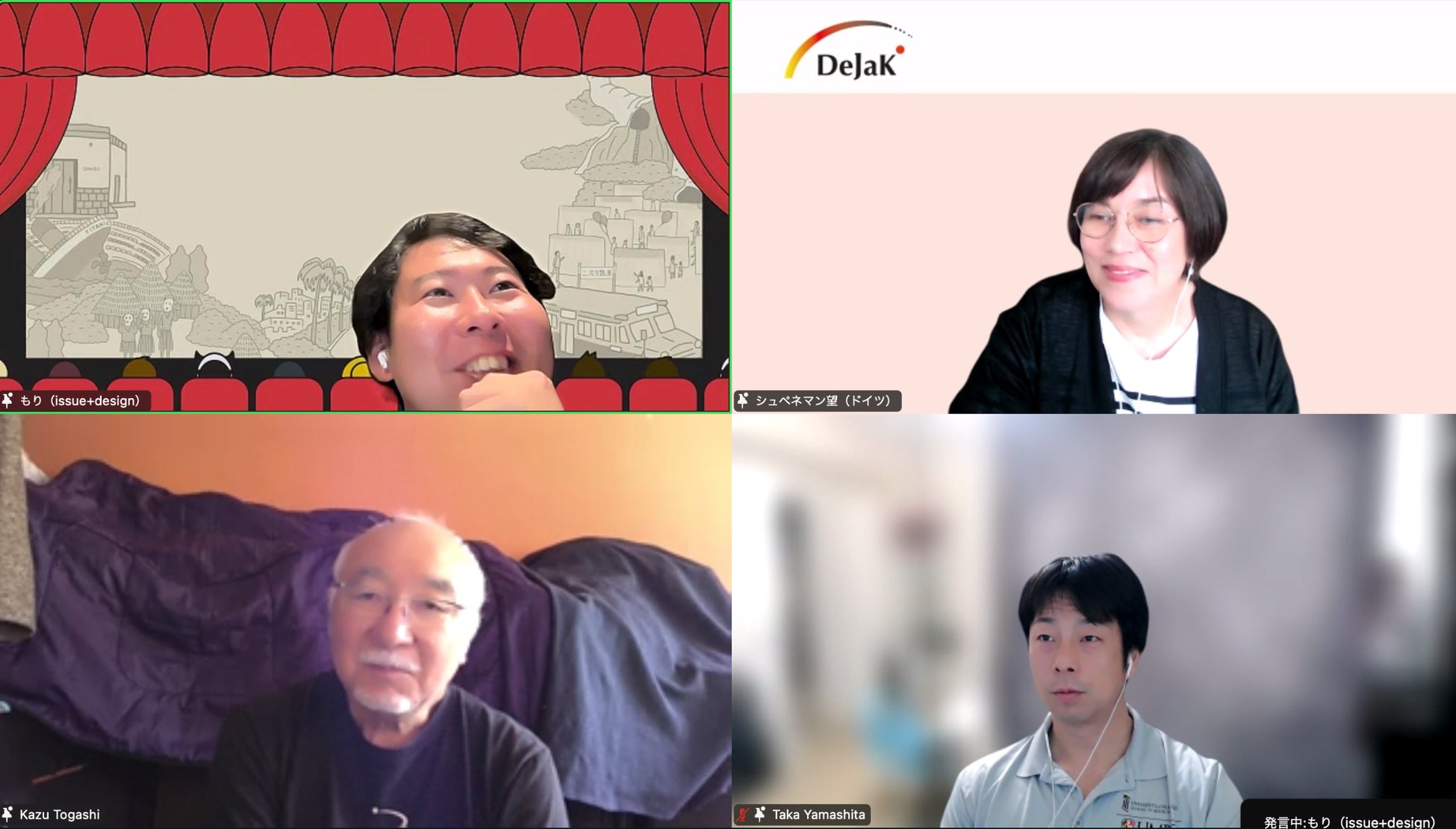 issue+designの森より、これまでの取り組みや認知症をテーマとしたプロジェクト、そしてなぜ映画化に挑戦するのかについてお話ししました。そして、私たちissue+designの活動に共感してくださり、それぞれの国で認知症にまつわる活動を行う3名のゲストをお迎えし、活動内容や認知症という課題がそれぞれの国でどのように取り扱われてるかについて、お話を伺いしました。