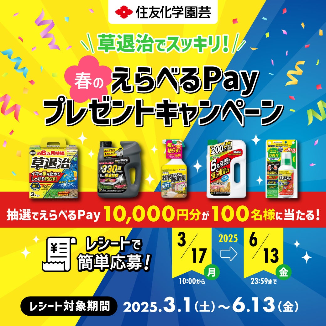 家庭園芸用薬品・肥料等を製造販売する住友化学園芸株式会社(本社:東京都中央区/代表取締役社長:梅田公利)は、「草退治®でスッキリ!春の選べるPayプレゼントキャンペーン」を実施いたします。