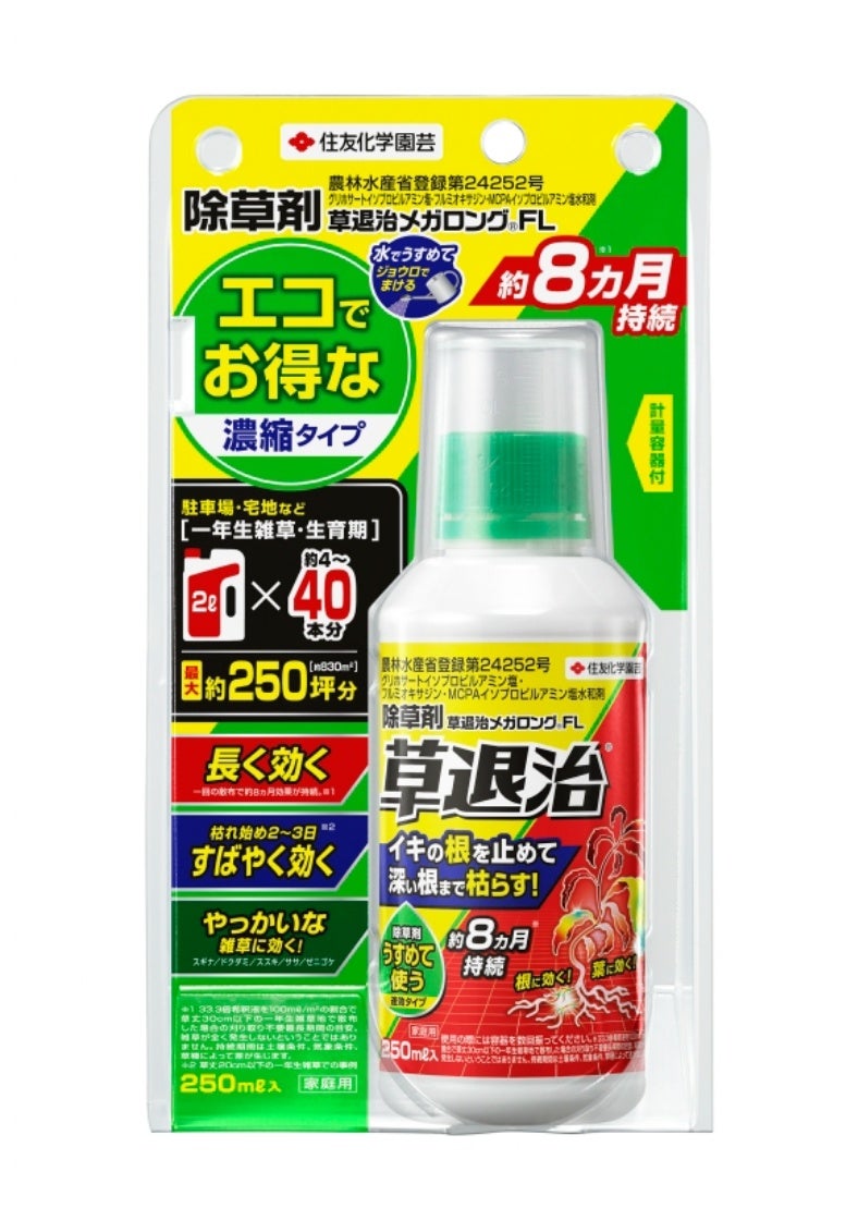 ※1 33.3倍希釈液を100ml/㎡の割合で草丈30㎝以下の一年生雑草地で散布した場合の刈り取り不要最長期間の目安。雑草が全く発生しないということではありません。持続期間は土壌条件、気象条件、草種によって差が生じます。