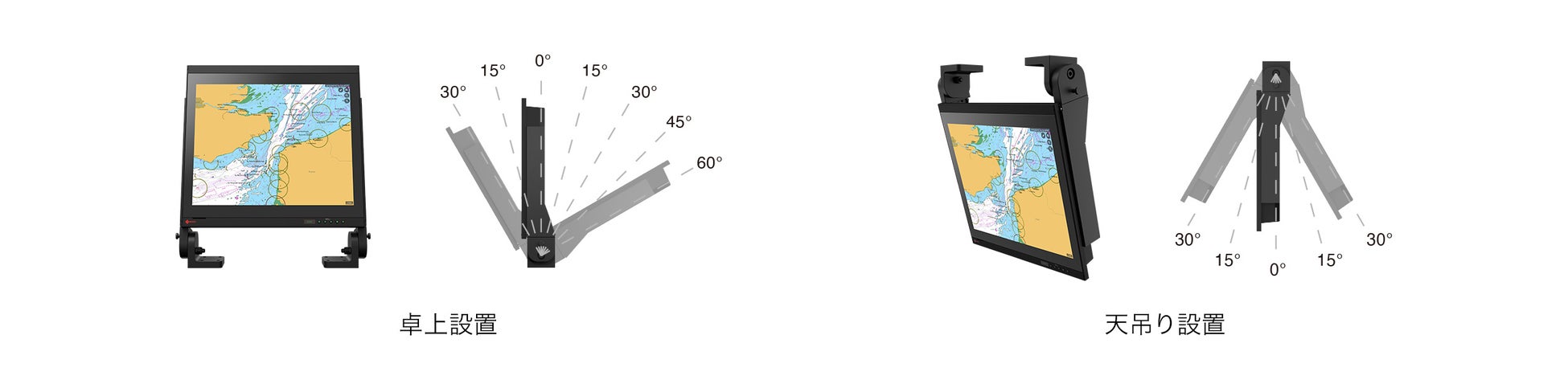 画面角度を15°ごとに調整できるので、電子海図やレーダーなどを見やすく表示可能。設置面積が小さく、省スペースに設置できます。世界各国の船級を取得※4しており、船舶機器としての信頼性を確保します。
