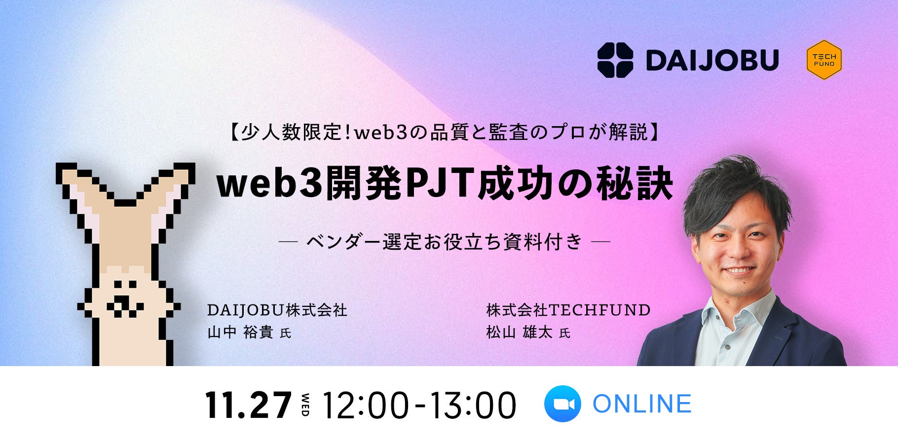 「起業家の可能性を最大化する!」をミッションに掲げる株式会社TECHFUND(所在地:東京都渋谷区、共同創業者:松山 雄太、川原 ぴいすけ、以下「当社」)とWeb3特化のソフトウェアテスト・品質保証サービス「ダイジョウブ」を運営するDAIJOBU株式会社(本社:東京都文京区、代表取締役社長:山中 裕貴、以下:DAIJOBU)はパートナーシップを締結いたしました。