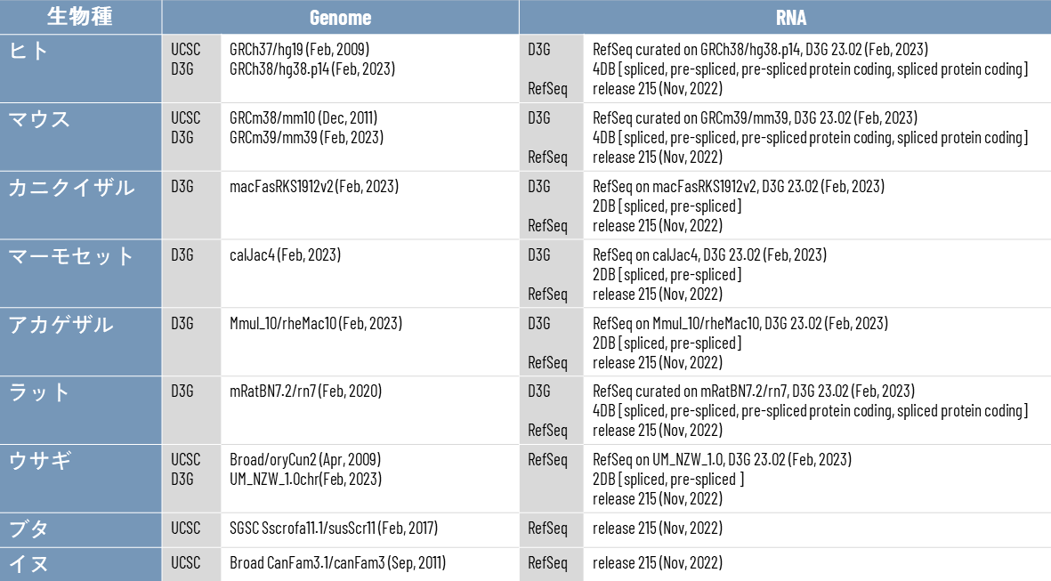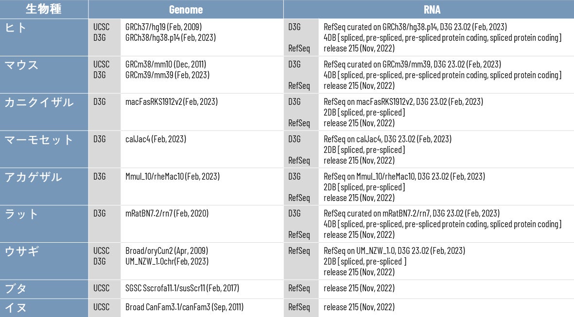 2023年版は、NCBI RefSeq、核酸医薬のためのゲノミクス・データベースD3G等の検索用データを更新し、9種の生物種をカバーする41のデータセットを同梱しました。D3G最新版では、新たにアカゲサルとウサギのデータセットが追加されており、そのほかの生物種についても最新のデータセットへと更新されています。