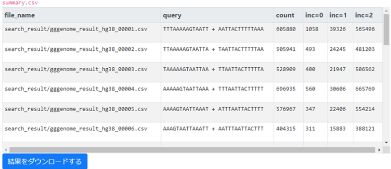 検索機能については、タイムアウトの制限を大幅に緩和することで、検索結果が多数ある場合にも途中で検索が終了することなく、すべてを出力できるように改善いたしました。また、検索結果画面にサマリを表示し、検索結果の一覧を確認することができるよう改善いたしました。検索結果のサマリはcsv形式でダウンロードすることも可能です。
