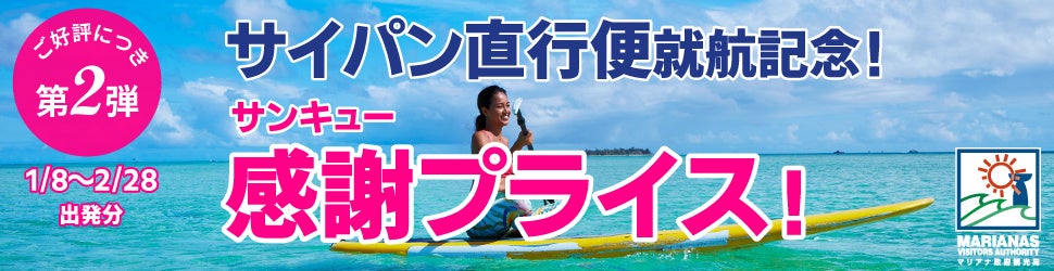 マリアナ政府観光局は、成田―サイパンの直行便就航を記念して、今年9月より展開している各種キャンペーンを来年2月28日まで延長することを決定いたしました。組み合わせて利用すると、なんとマリアナ旅行が最大13万円相当もお得になる過去最大級のキャンペーンです。
