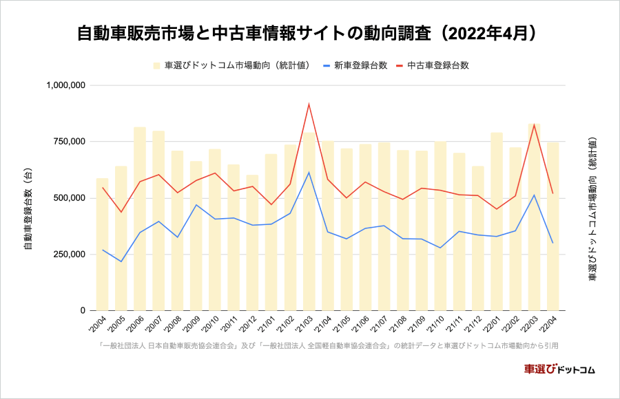 中古車情報サイト「車選びドットコム(https://www.kurumaerabi.com/)」を運営する株式会社ファブリカコミュニケーションズ(本社所在地:愛知県名古屋市中区、代表取締役社長:谷口 政人)より、2022年4月における自動車登録台数の推移と、中古車情報サイト「車選びドットコム」の販売台数推移から、中古車市場の動きをまとめたレポートをご案内いたします。