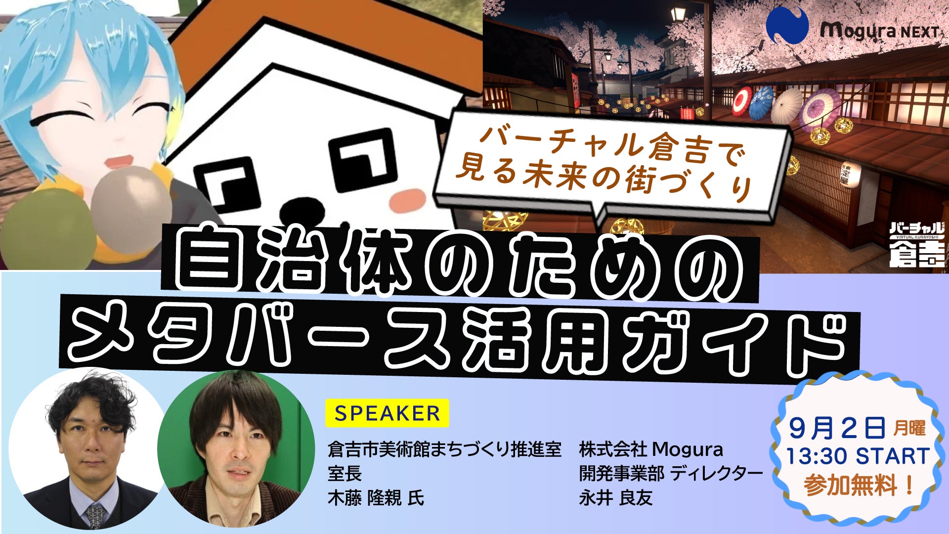株式会社Mogura(本社:東京都千代田区、代表取締役社長:久保田 瞬、以下「当社」)は、ウェビナー「自治体のためのメタバース活用ガイド—バーチャル倉吉で見る未来の街づくり」を2024年9月2日に開催いたします。