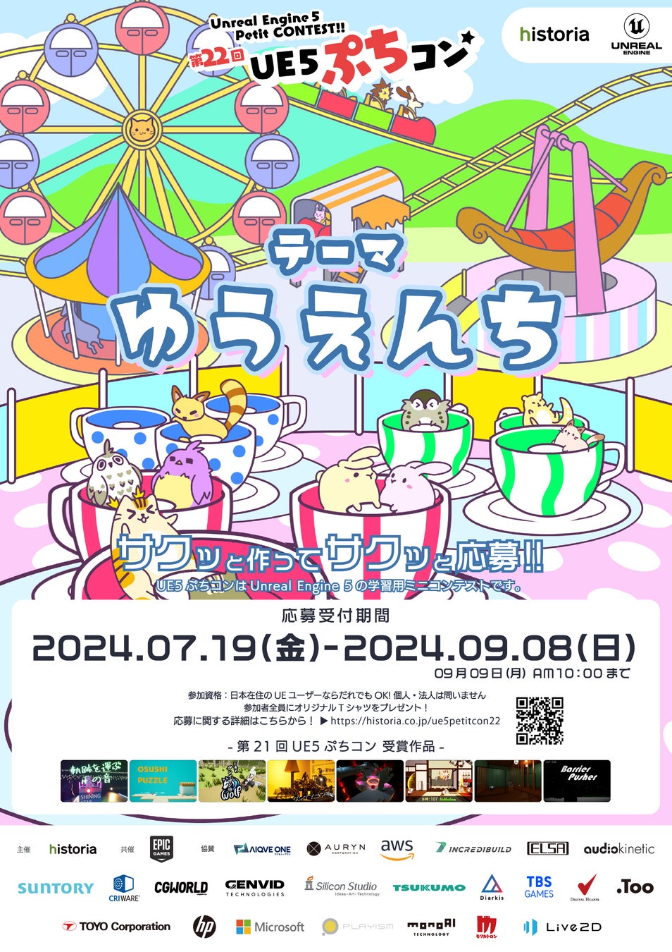 Unreal Engine(以下、UE)専門ゲーム開発会社 株式会社ヒストリアが主催するUE学習向けミニコンテスト”第22回UE5ぷちコン”のテーマを「ゆうえんち」と発表、作品エントリーを開始いたしました。2024年7月19日(金)~2024年9月8日(日)の期間、エントリーを受け付けております。