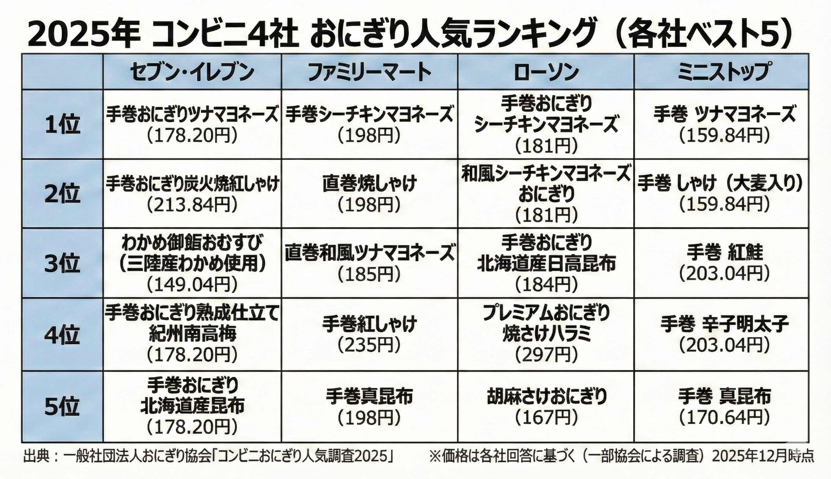 一般社団法人おにぎり協会(以下、おにぎり協会)は、主要コンビニエンスストアを対象に実施した「おにぎり調査2025」(対象期間:2025年1月〜12月)について、各社回答を取りまとめましたのでお知らせします。