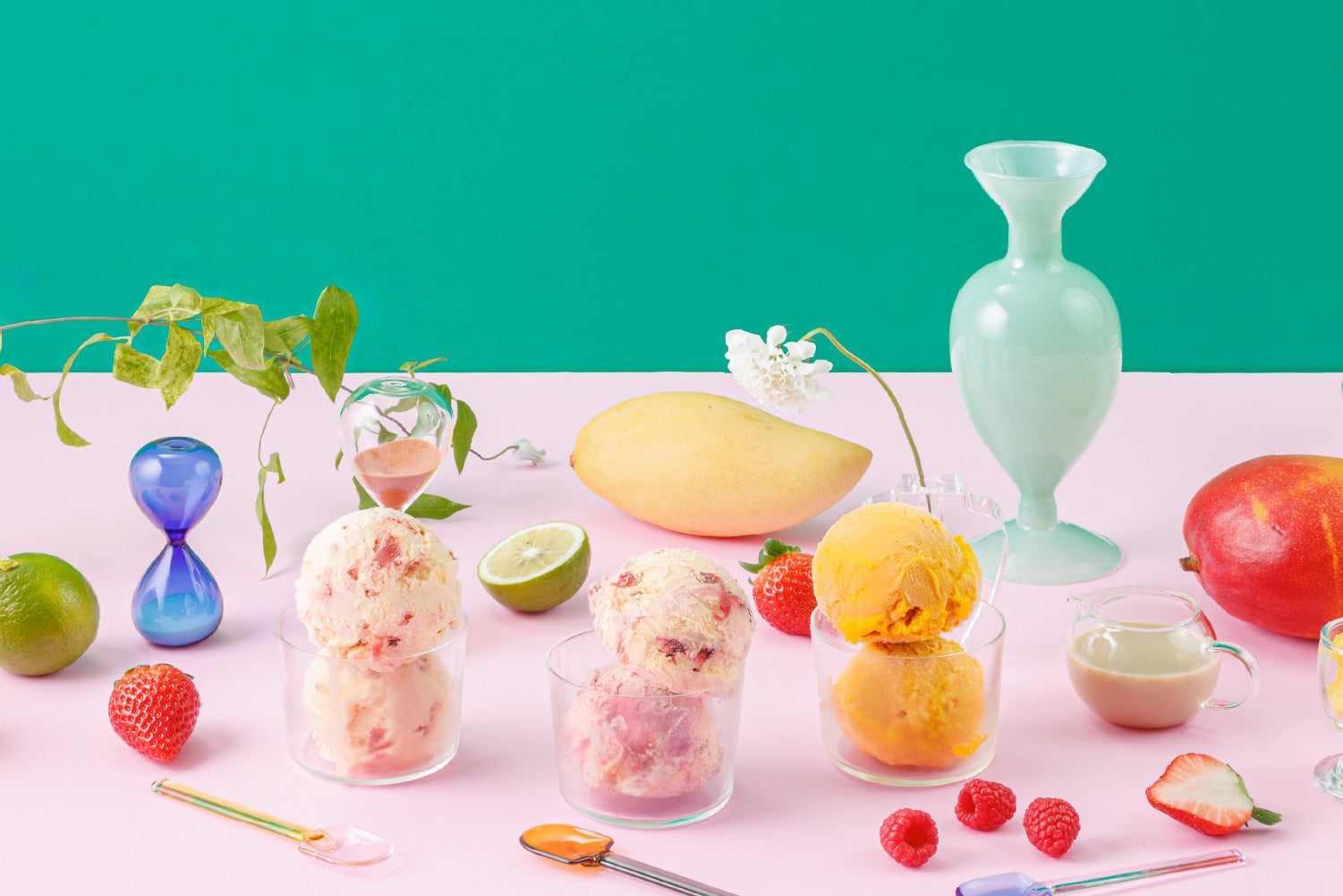 天然素材で香り付けした〈ミルクティーカシス〉、紅ほっぺとブリュレの満足感が広がる〈紅ほっぺブリュレ〉、そして2種のマンゴーと木頭柚子が立体的に香り立つ〈2種のマンゴーと柚子のソルベ〉。
