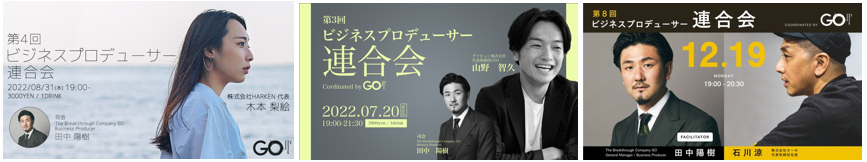 GOのビジネスプロデューサーチームのリーダー田中陽樹のファシリテーションのもと、「ビジネスプロデュースの力」で新たな価値を生み出していくための仕事への向き合い方、アイデアをアイデアのまま終わらせずに実行に移す技術を獲得できる場として、完全紹介制・月額制のコミュニティ型で運営しています。