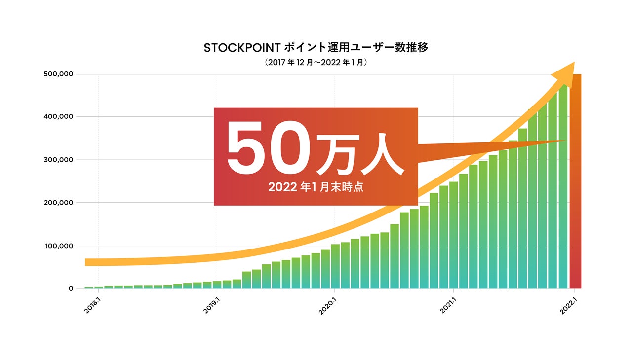 個別株式ポイント運用サービスを提供するSTOCK POINT株式会社(本社:東京都港区、代表取締役:土屋 清美、以下「当社」)は、当社が提供するポイント運用サービス「StockPoint(ストックポイント、以下「StockPoint」)」の累計ユーザー数が、2022年1月に50万人を突破したことをお知らせします。