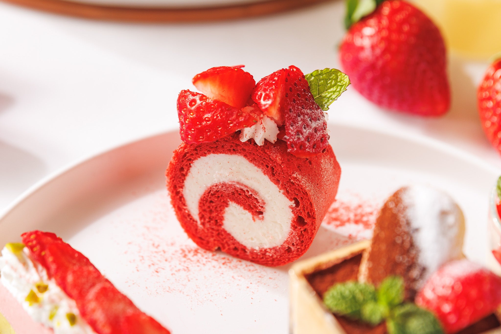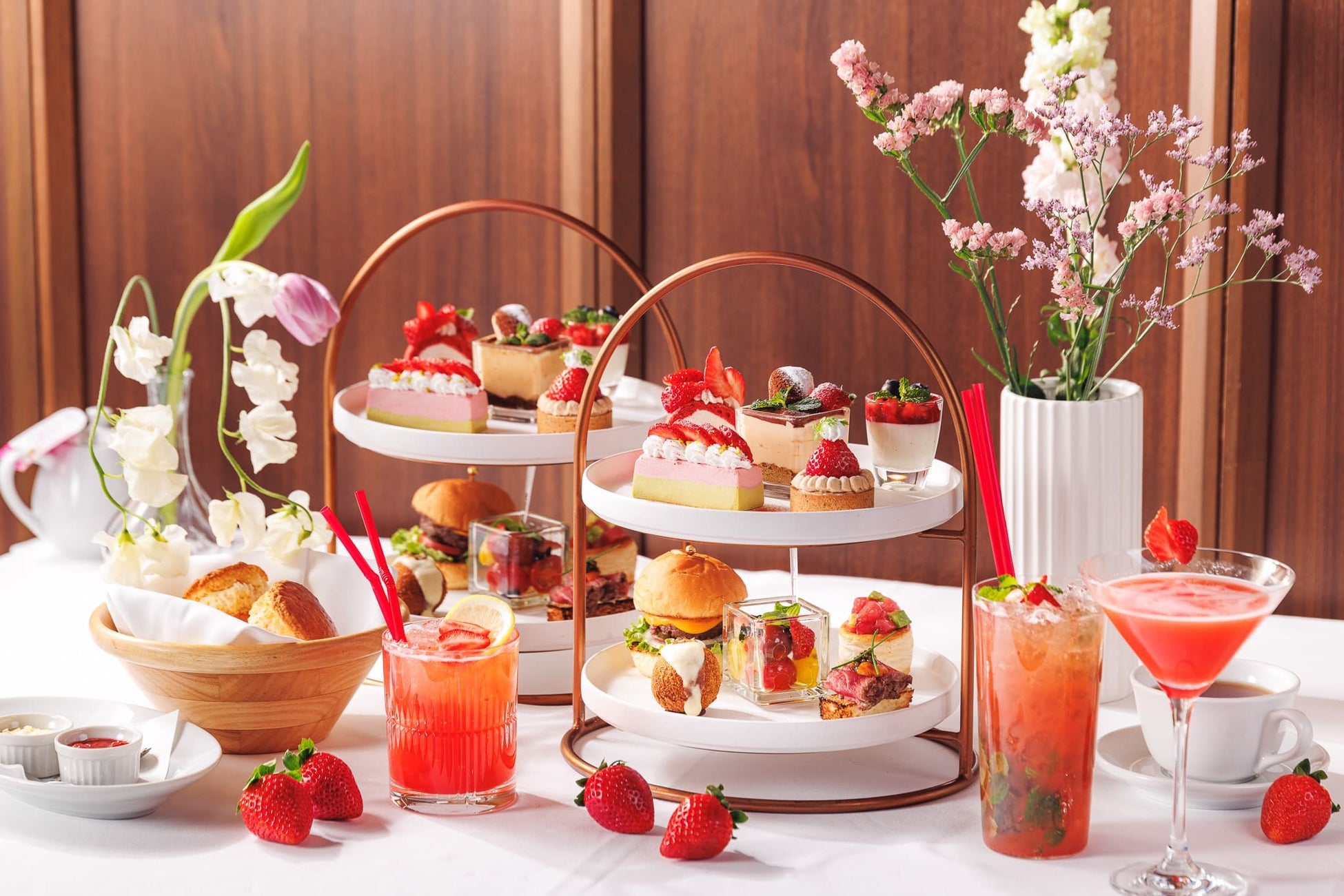 スイーツには、いちごの魅力をさまざまな表情で楽しめる5種をラインアップ。いちごと紅茶のタルト や いちごとピスタチオのムース などの新作を含む、華やかでアフタヌーンティーにぴったりのデザートが揃います。