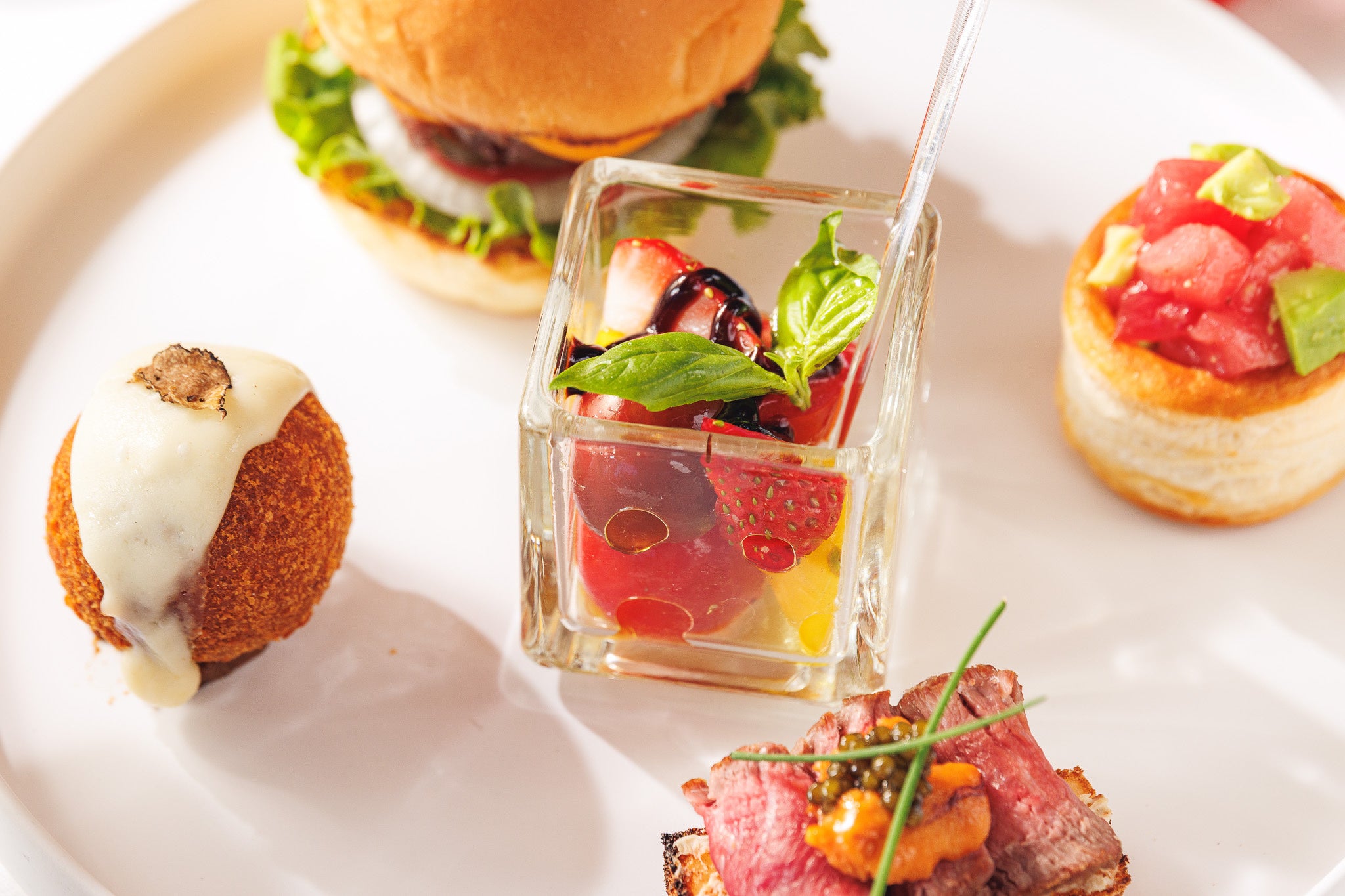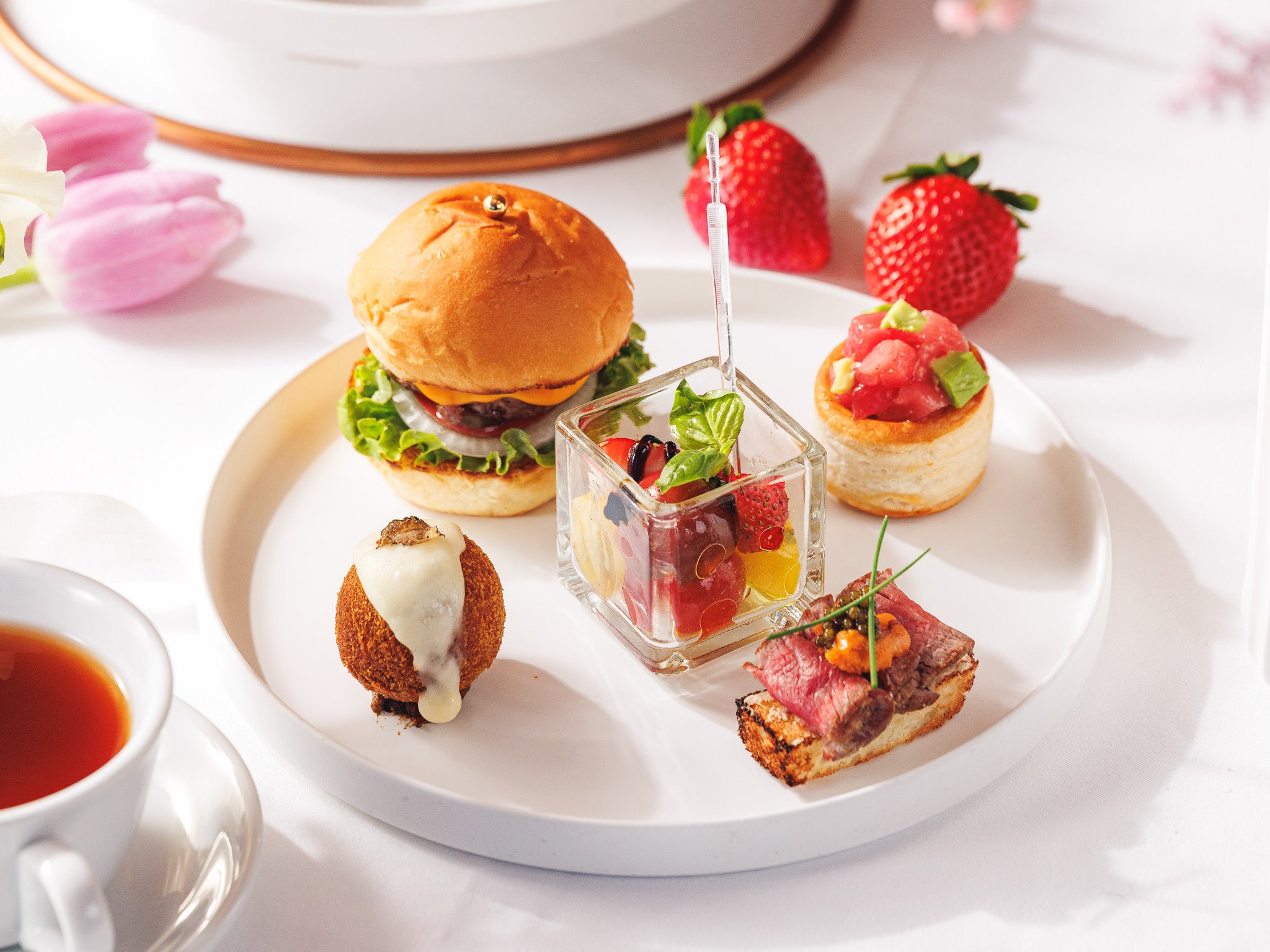 今回のアフタヌーンティーでは、ブランドを象徴する USDAプライムビーフ※を使用したミニチーズバーガー をはじめ、雲丹×ローストビーフ×キャビア を重ねた華やかなブリオッシュオープンサンド、さらに 苺のカプレーゼ や トリュフオイルを忍ばせたアランチーニ、鮪とアボカドのタルタルパイ など、レストランクオリティのセイボリー5種をご用意しました。