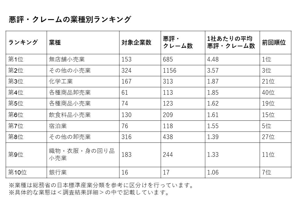 ・2021年調査に続き無店舗小売業が1位。通販事業へのクレームがネット上に頻出