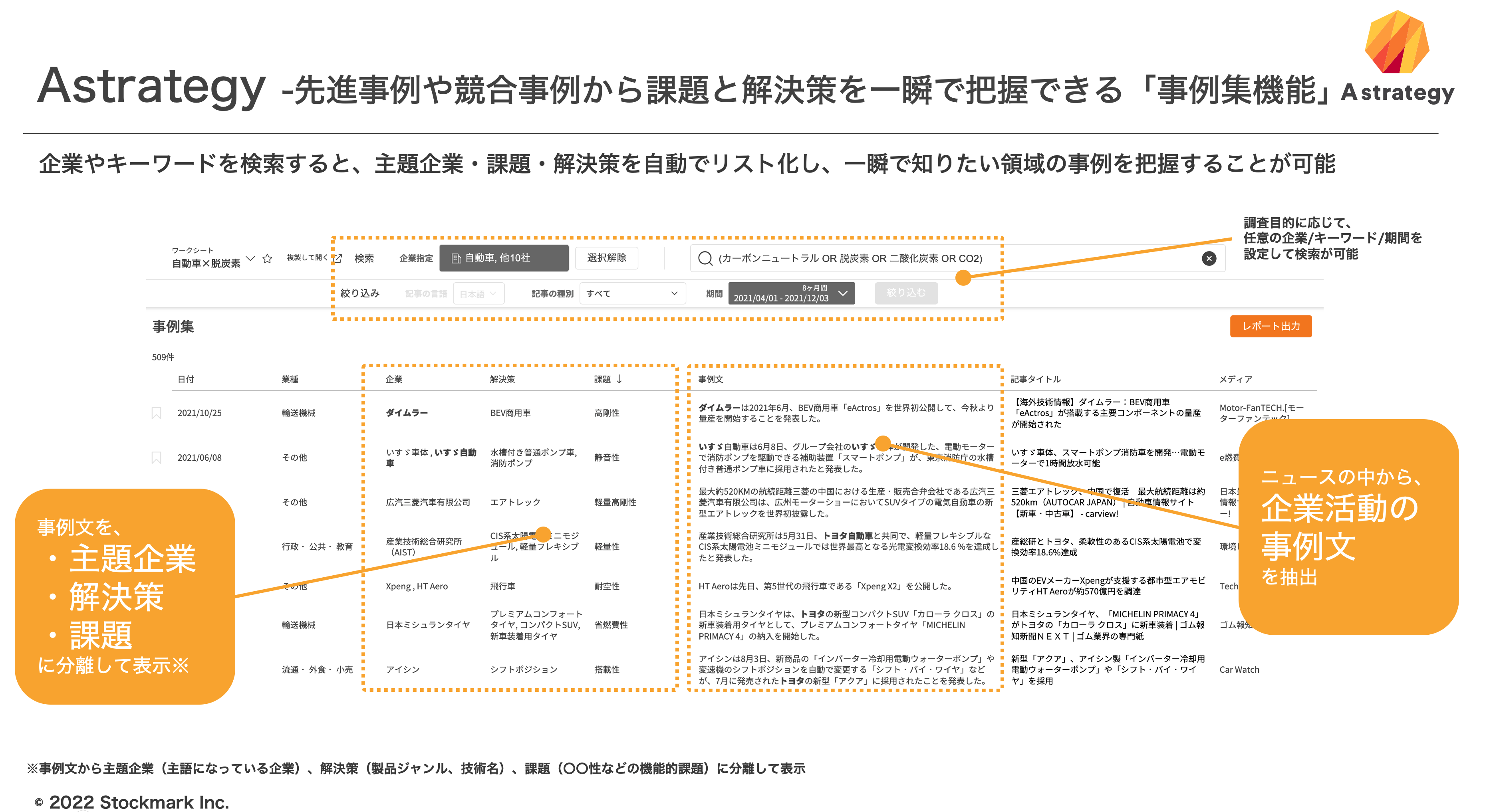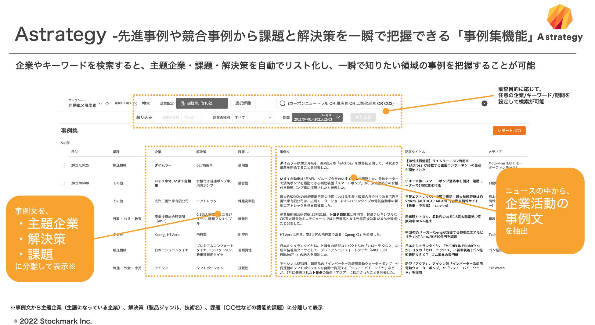 この度、市場動向や競合の動きをAIが可視化し、事業企画をサポートするプラットフォーム「Astrategy」において、新規事業に役立つ事例や、事業環境を把握するために必要な事例を一瞬で発見できる新機能「事例集」をリリースするとともに、本機能における要素技術の特許出願を行いました。
