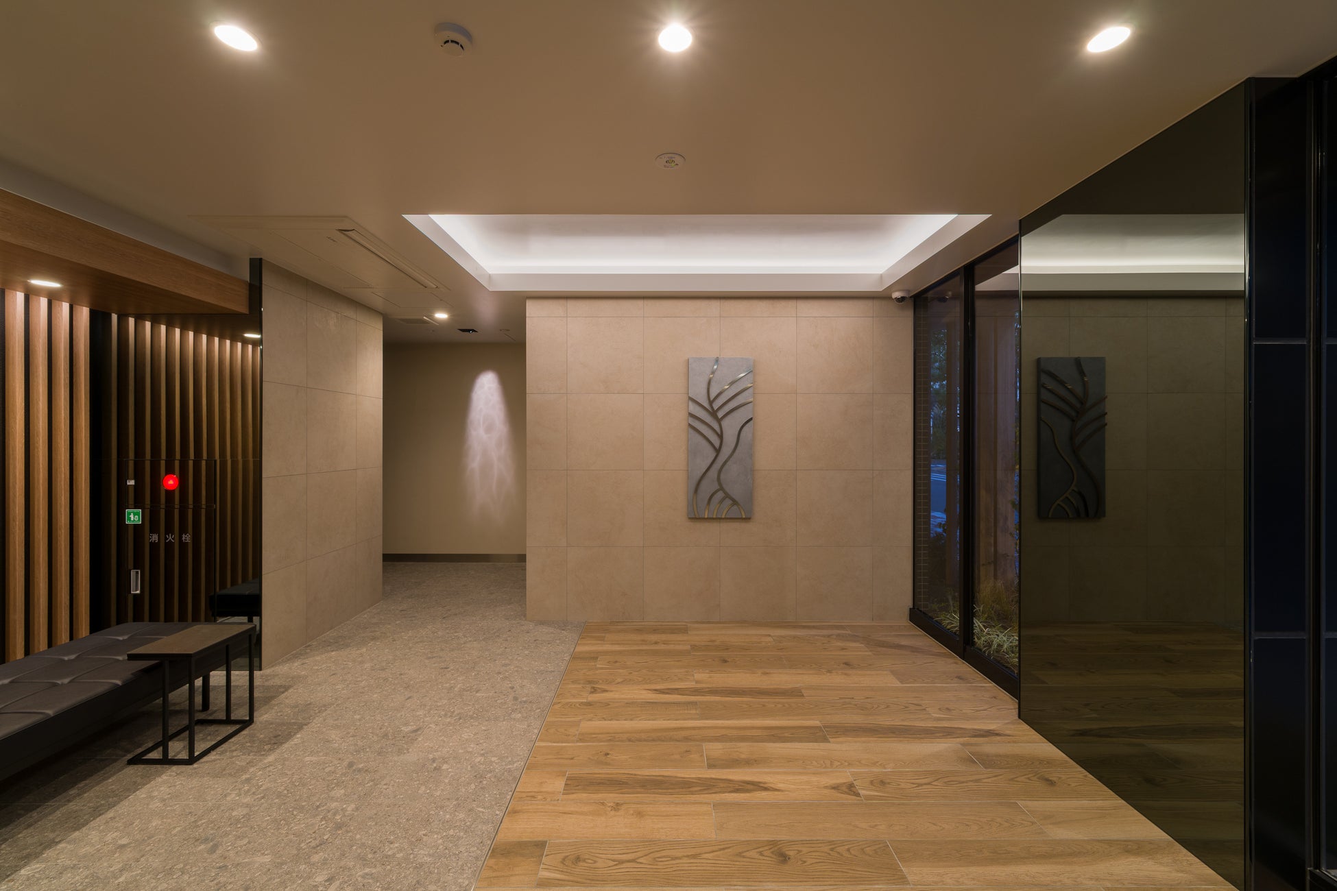 本物件では、エントランスとエレベーターホールにハンズフリーキーを導入し、手が塞がっていても鍵を取り出すことなく、エントランスセキュリティ解除やエレベーター呼び出しを可能にしました。また、エントランスホールには、水面の揺らぎを表現したプロジェクター照明を設置し、流れるせせらぎの音による癒しの空間を演出しました。