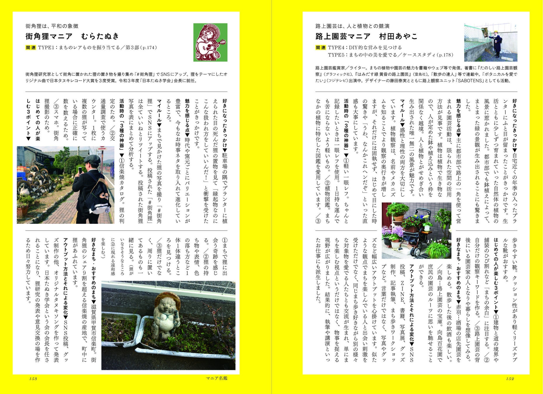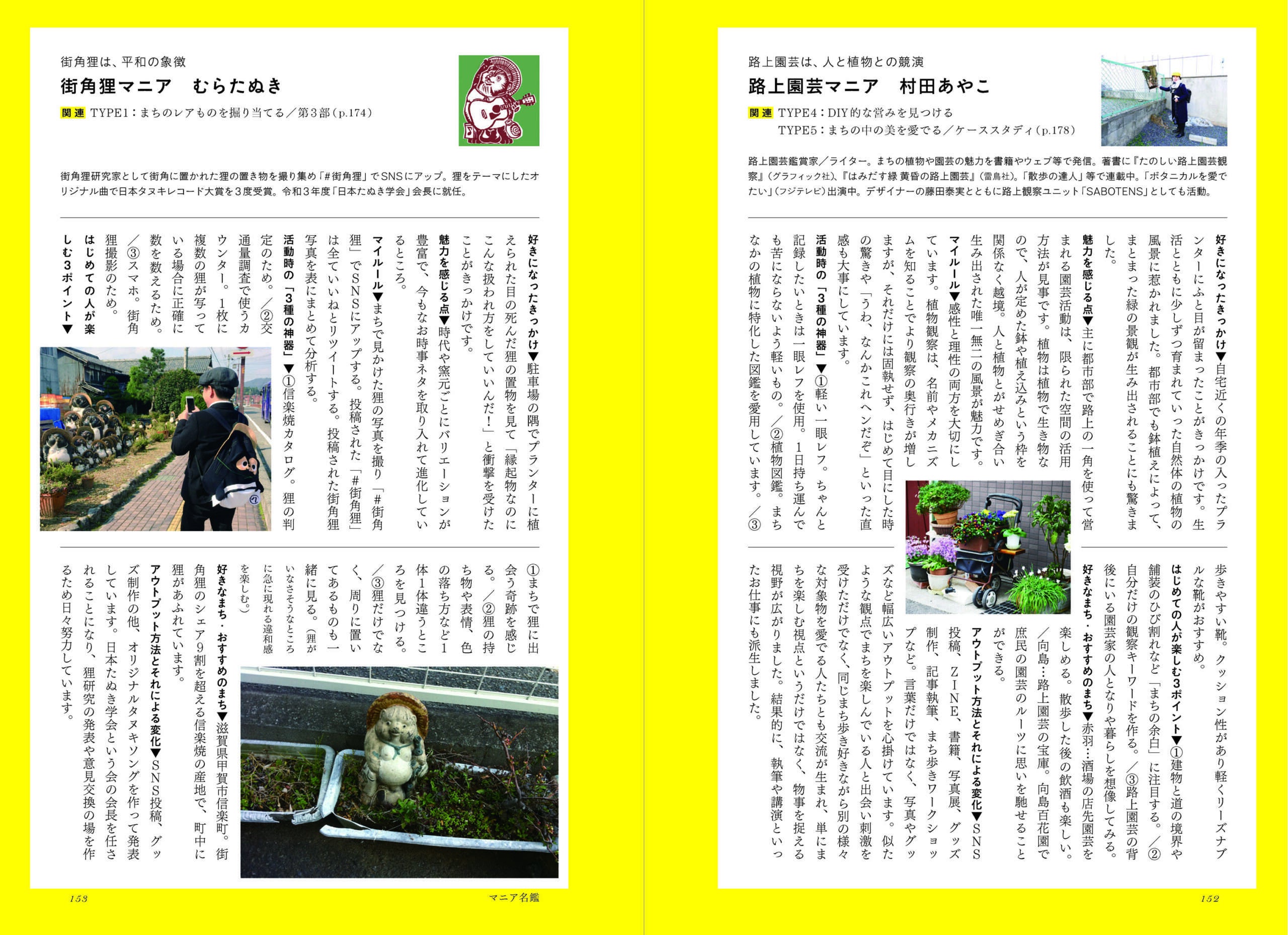ドジっ子看板マニア・赤沼俊幸/商店街マニア・あさみん/片手袋マニア・石井公二/電線マニア・石山蓮華/路線図マニア・井上マサキ/空想地図マニア・今和泉隆行(地理人)/バックヤードマニア・今井夕華/峠の鉄道の歴史マニア・上原将太/歩行者天国マニア・内海皓平/顔ハメ姿マニア・裏パネの人/いぬくそ看板マニア・うんこ看板/小屋マニア・遠藤宏/カラーコーンマニア・おかだゆか/鉄塔マニア・加賀谷奏子(鉄塔ファン)/ガラスブロックマニア・ガラスブロックマニアック/まちのチャーミングマニア・木村りべか/旧町名マニア・旧町名をさがす会 102so/電気風呂マニア・けんちん/室外機マニア・斎藤公輔(NEKOPLA)/電飾マニア・サイバーおかん/火曜サスペンスごっこマニア・さかもツインねね/顔ハメ看板に自分がハマって写真を撮るマニア・塩谷朋之/アート系壁マニア・シガキヤスヒト/野良サインマニア・ちかく/ゴムホースマニア・中島由佳/松田ペット看板マニア・新稲ずな/ドボクマニア・八馬智/道に落ちているもの(落ちもん)マニア・藤田泰実/珍スポットマニア・松澤茂信/マニアのマニアによるマニアのためのアパレルマニア・マニアパレル/野良イスマニア・Mr.tsubaking/路上園芸マニア・村田あやこ/街角狸マニア・むらたぬき/ドネルケバブマニア・メルツのドネルケバブログ/散歩マニア・ヤスノリ/平成レトロマニア・山下メロ