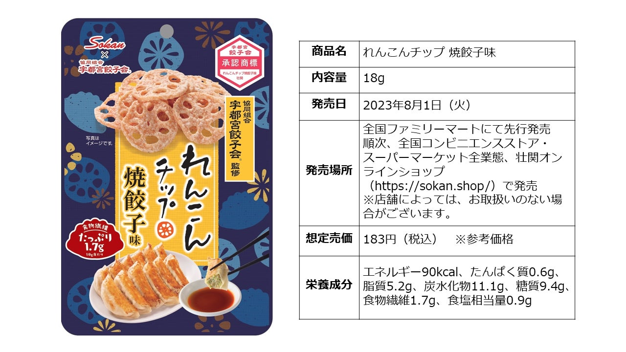 株式会社壮関(本社:栃木県矢板市 代表取締役社長:板山 健一)は、新商品『れんこんチップ 焼餃子味』を2023年8月1日(火)より全国のファミリーマートにて先行販売いたします。