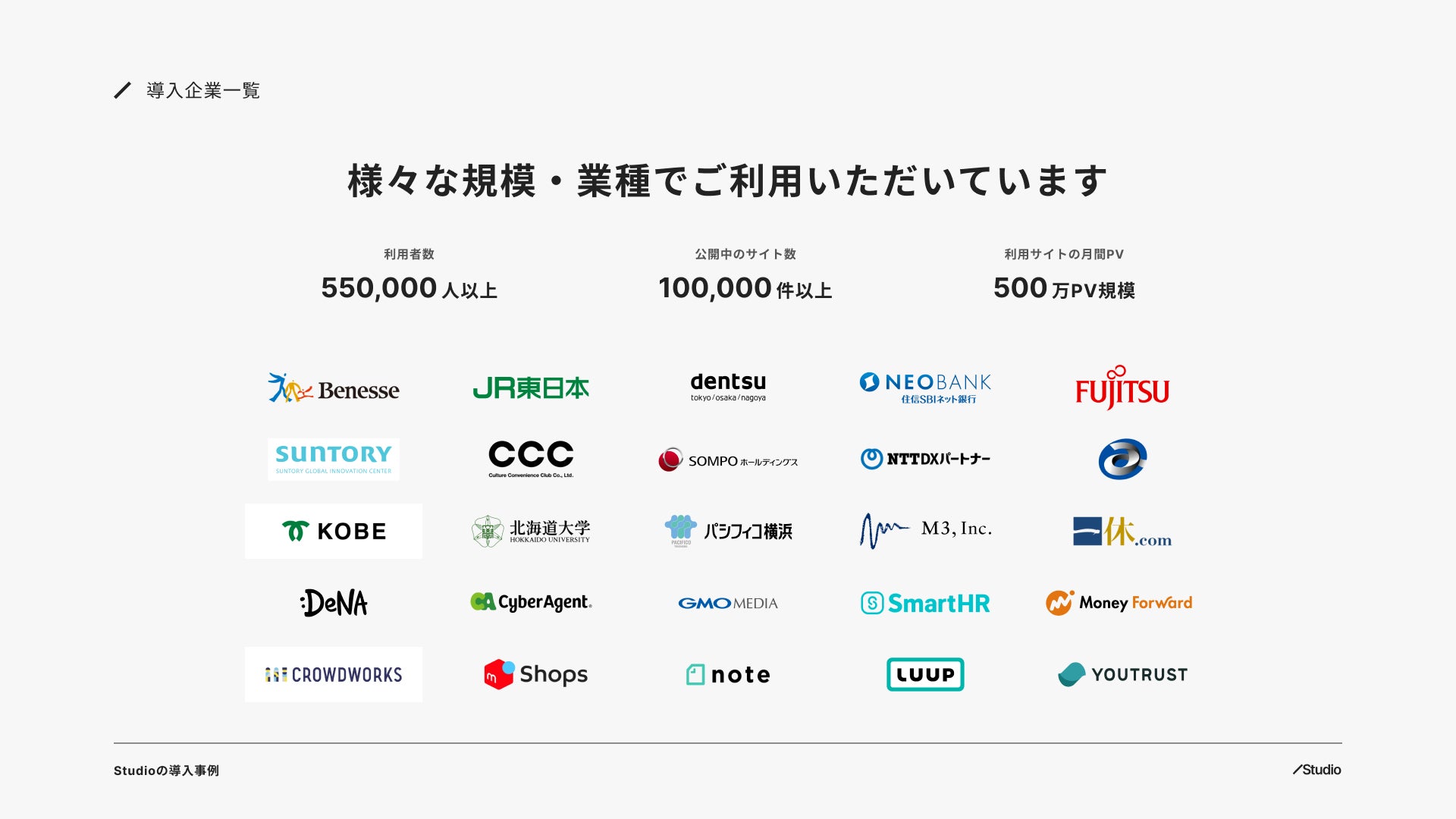 弊社は、クラウドベースのノーコードWeb制作プラットフォーム「Studio」を提供し、多くのお客様のWebサイトをお預かりしています。