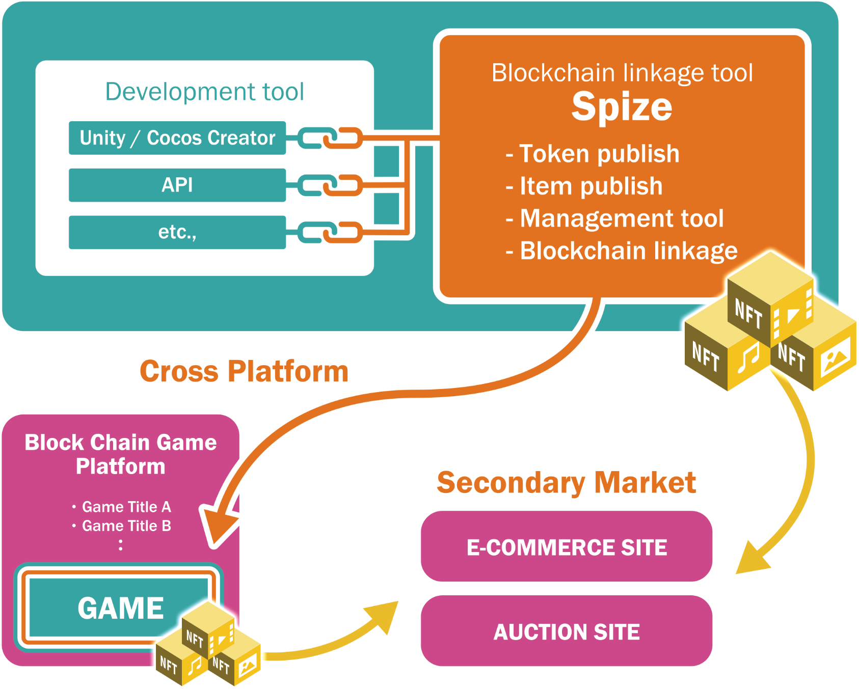 「Spize」を導入する事でコンテンツとの連携部分のコスト・開発工数削減とサービス本体の開発の迅速化を実現できるだけでなく、NFTを中央管理する場合のハッキングリスクを回避するためのコンテンツの分別管理や、NFTを管理するマネージドツールが付帯しており、アドミニストレーションや運営オペレーションを簡易化して運営コストの削減を図ります。