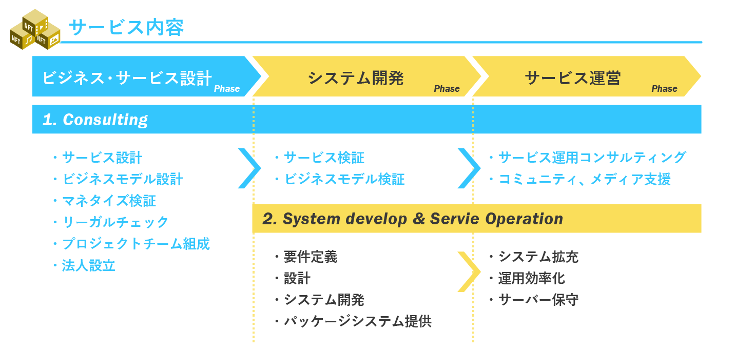 テコテックでは、NFT に関わるビジネス展開に関して、 Spize を含むパッケージのご提供のみならず、(1)ビジネス・サービス設計(2)システム開発(3)サービス運営まで、一気通貫してサービスを提供しています。