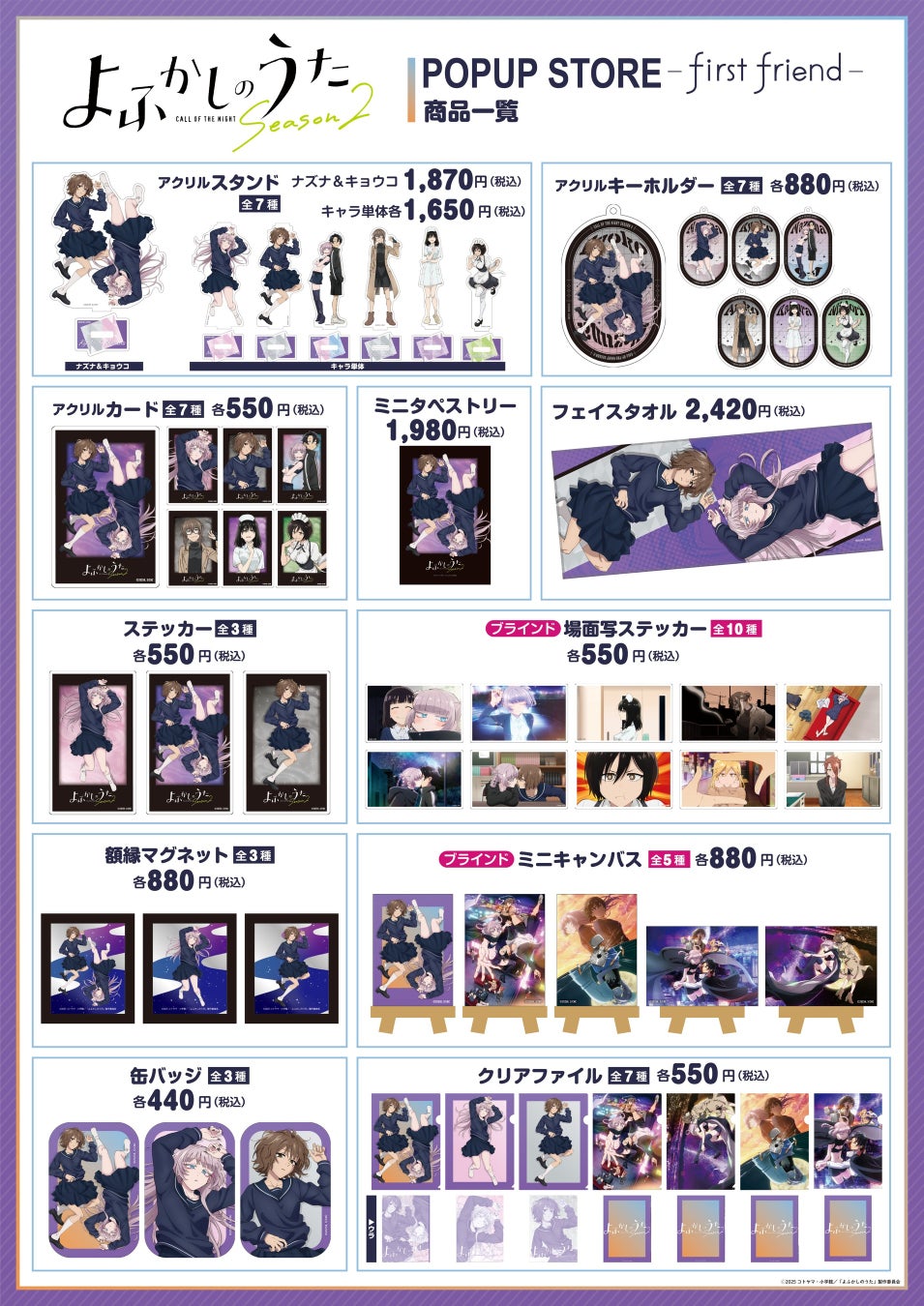 TVアニメ「よふかしのうた Season2」で描かれた“ナズナとキョウコの最初の出会い”をモチーフに描き下ろした新作ビジュアルのオリジナルグッズを販売します。本会場以降も順次各地で開催を予定しています。