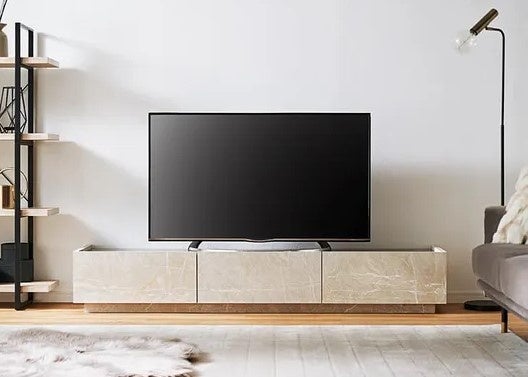 まるで本物の石のような「ストーン柄」とステンレス天板の組み合わせが美しいテレビ台です。