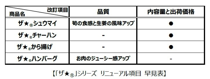 「ザ★®シュウマイ」はさらにおいしくリニューアルしながら、内容量を9個入り(288g)から9個入り(279g)に変更します。内容量の変更にあわせて、出荷価格も変更します。