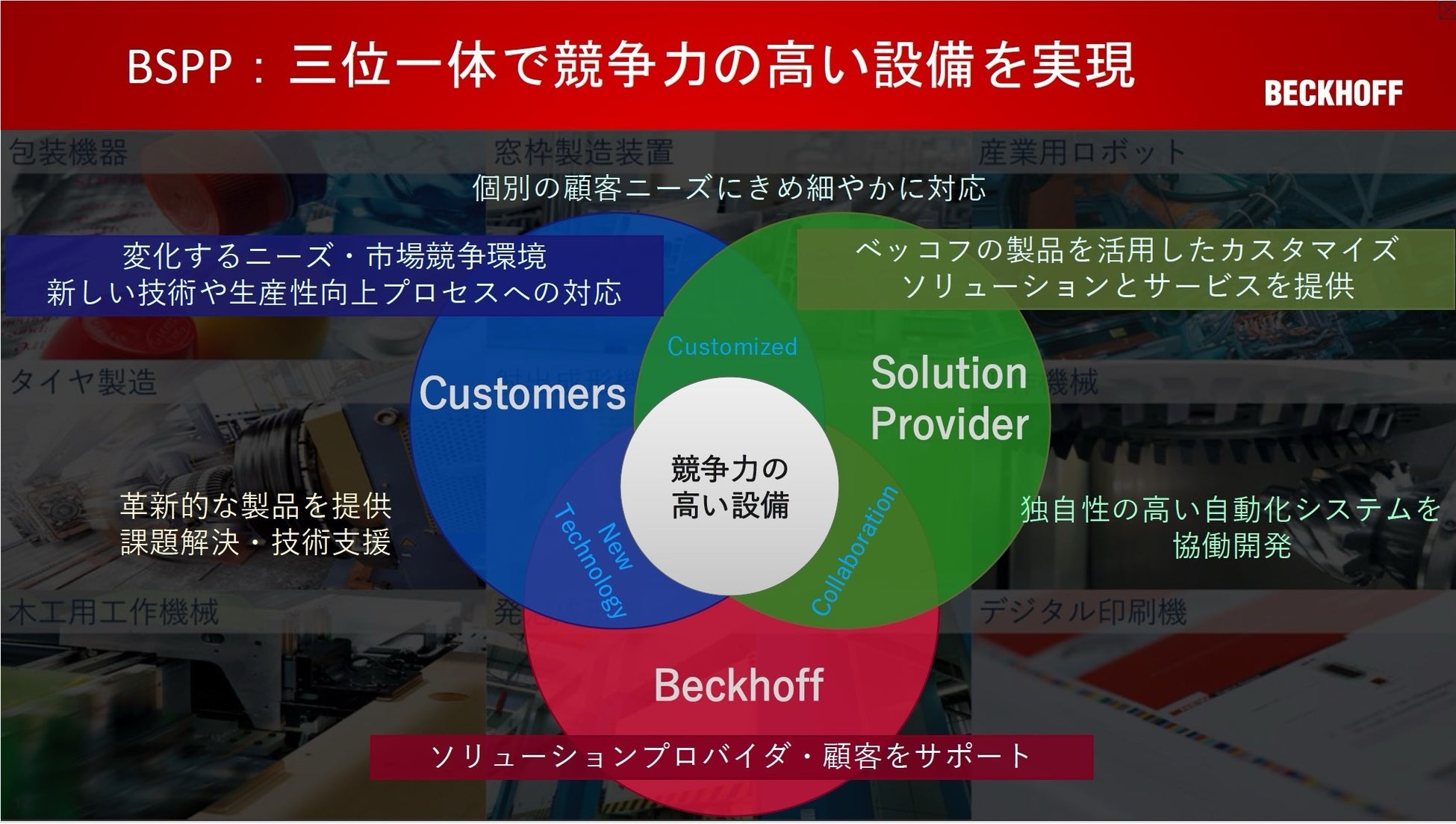 BSPP参画企業との協働を通じ、個々のお客様の課題にきめ細やかに対応し、競争力の高い設備構築を通じて日本の製造業の発展に貢献します。