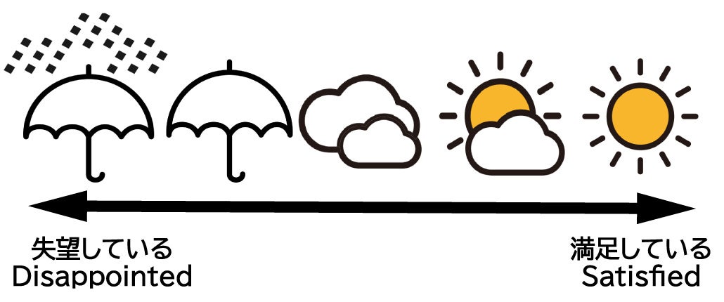 評価の5段階:評価の5段階:「土砂降り」「雨」「曇り」「曇り時々晴れ」「晴れ」