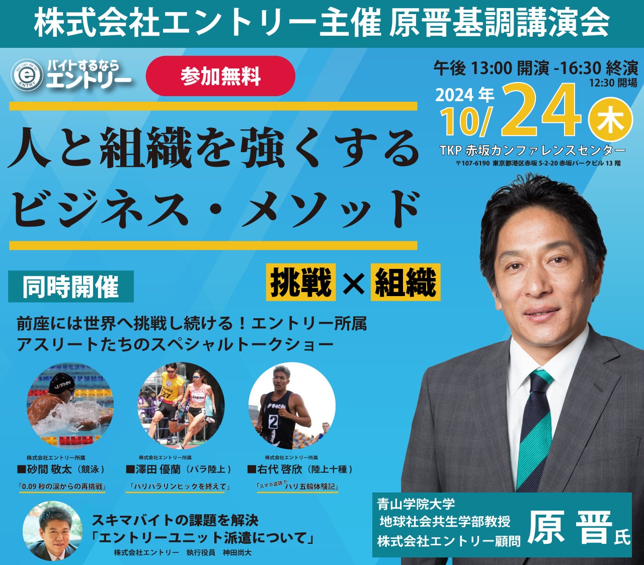 「人と仕事の縁むすびに挑戦し続ける」という企業理念に沿って、主に仕事紹介サイト「スマジョブ」やお仕事マッチングサービス「シェアジョブ」を運営する株式会社エントリー(本社:東京都新宿区、代表取締役:寺本潤、以下エントリー)は、2024年10月24日(木)に弊社顧問である原晋氏(青山学院大学地球社会共生学部教授)を講師にお迎え、『株式会社エントリー主催 原晋基調講演会』を開催いたします。