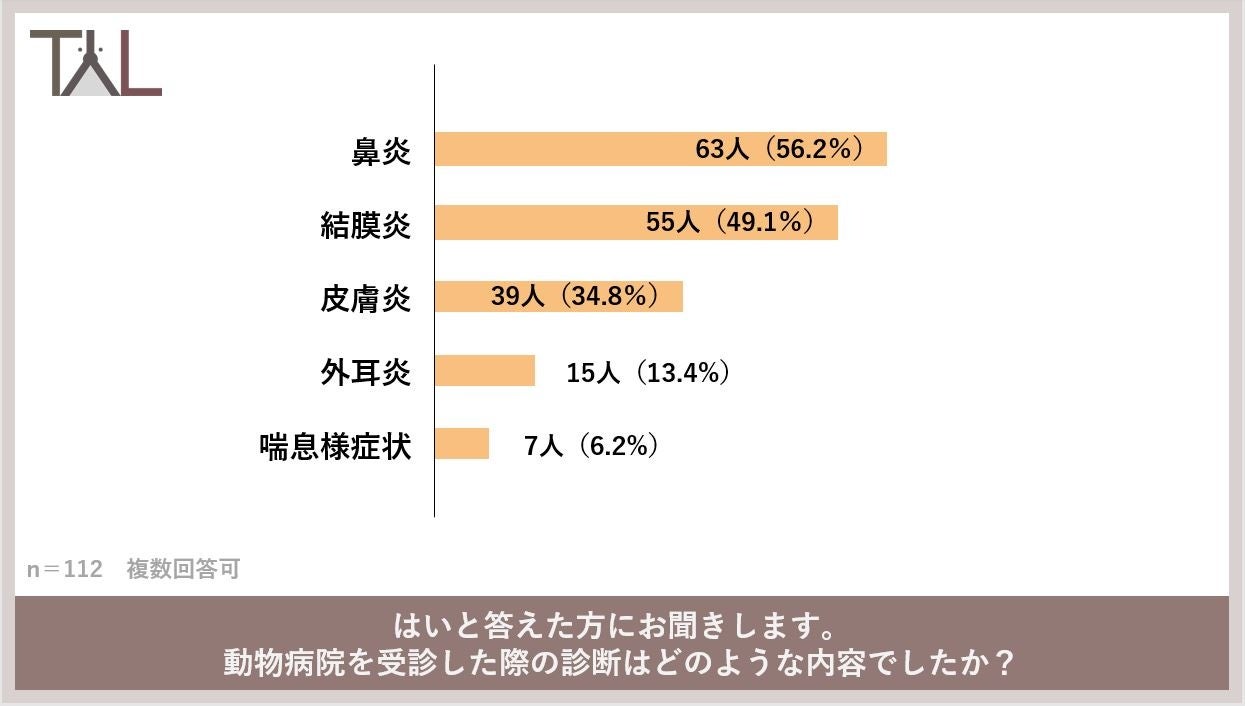 犬猫の飼い主428名に対し、「実際に花粉症(アレルギー)で動物病院を受診したことがありますか?」と質問したところ、「はい」と答えた飼い主は26.2%、「いいえ」が73.8%でした。そのうち、「はい」と答えた112人に対して、「動物病院を受診した際の診断はどのような内容でしたか?」と質問したところ、もっとも多かったのが鼻炎(56.2%)、2位結膜炎(49.1%)、3位皮膚炎(34.8%)、4位外耳炎、5位喘息様症状でした。花粉症と思われる症状で動物病院を受診した、約半数の犬猫に対して獣医師から鼻炎や結膜炎の診断が出ていることが分かりました。