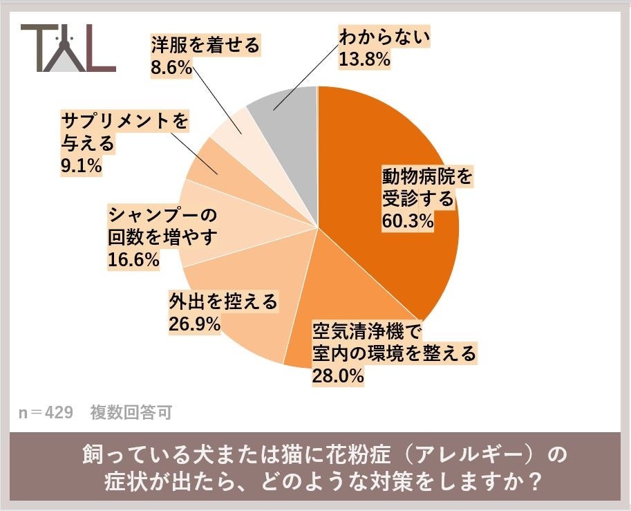 ◇飼っている犬または猫に、花粉症(アレルギー)の症状が出た際の対策として、もっとも多かったのは「動物病院を受診する」、2位「空気清浄機で室内の環境を整える」、3位「外出を控える」。6割以上の飼い主が花粉症の症状が出た際の対策として動物病院を受診する考え。