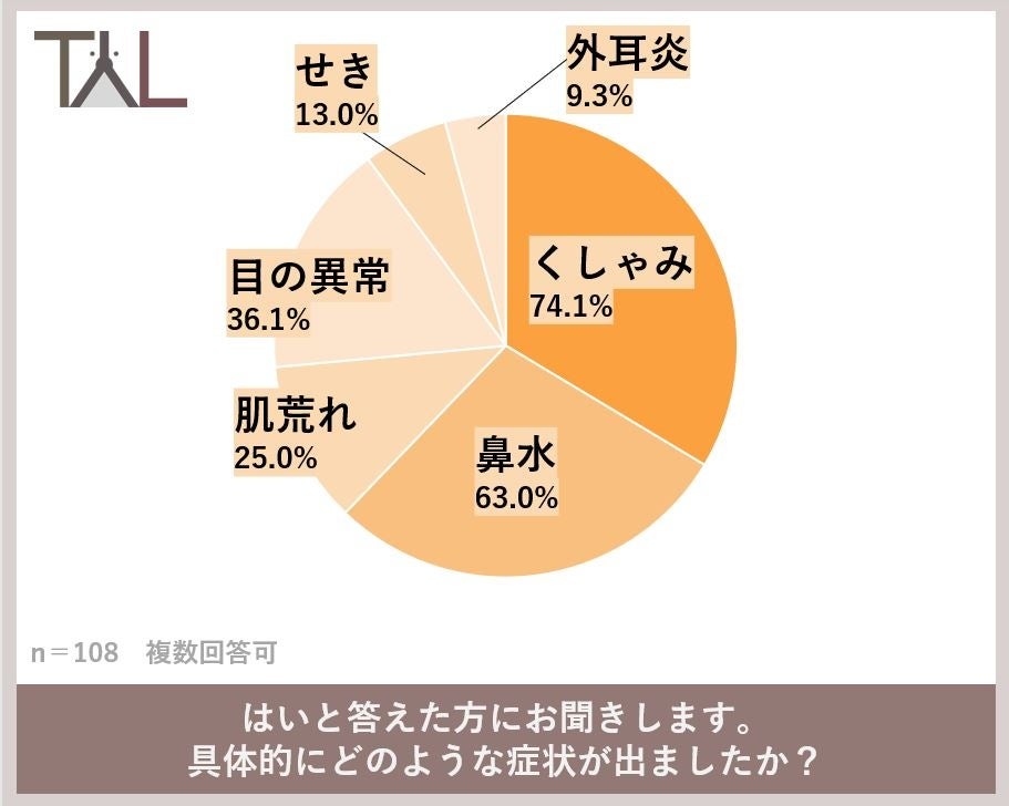犬猫の飼い主340名のうち、今年花粉症の症状が出たと答えた106人に対し「はいと答えた方にお聞きします。具体的にどのような症状が出ましたか?」と質問したところ、1位くしゃみ(74.1%)、2位鼻水(63.0%)、3位目の異常(36.1%)、4位肌荒れ(25.0%)、5位せき(13.0&)、6位外耳炎(9.3%)という結果に。犬猫も花粉によるアレルギー症状である、くしゃみや鼻水といった症状が見られることが分かりました。