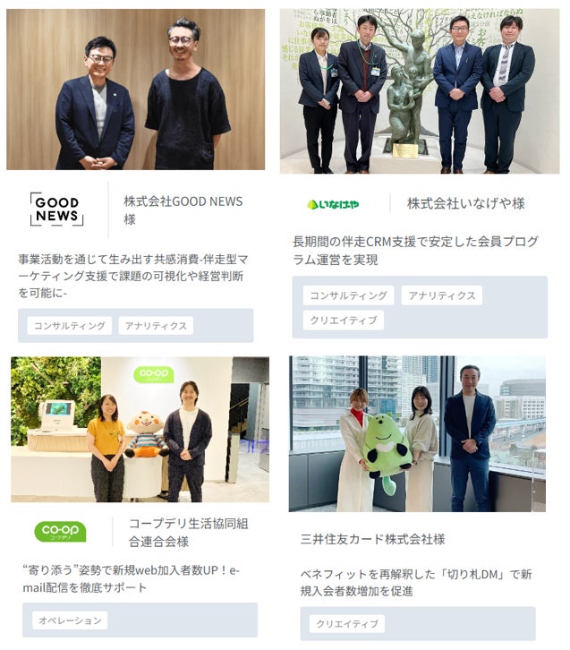 単なるツール導入や運用、提案のみのコンサルティングに留まらず、戦略立案~施策実行・効果検証まで伴走型でご支援しており、その支援実績を当社コーポレートサイトで公開しております。