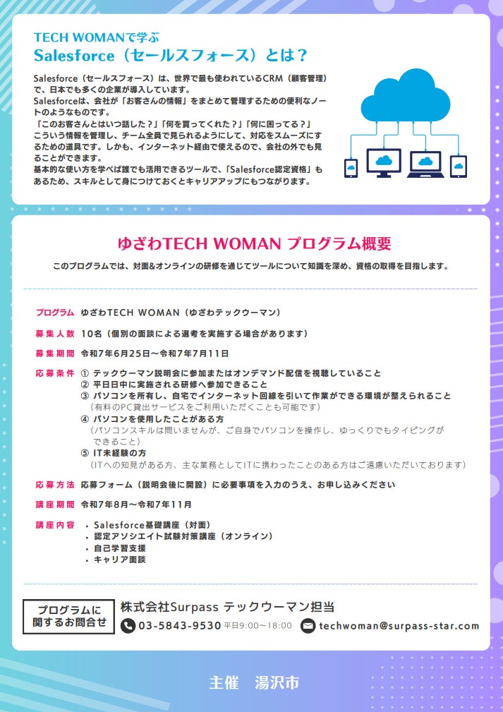 「ゆざわTECH WOMAN」は、湯沢市在住の女性を対象に、Salesforceなどのクラウド業務アプリケーションを活用した実践的なスキル習得を支援する研修プログラムです。