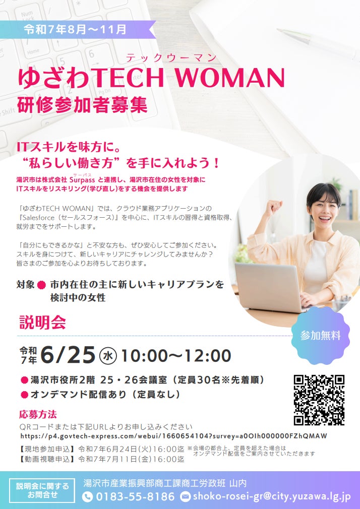 湯沢市×Surpass 女性のキャリア支援「ゆざわTECH WOMAN」研修参加者を募集