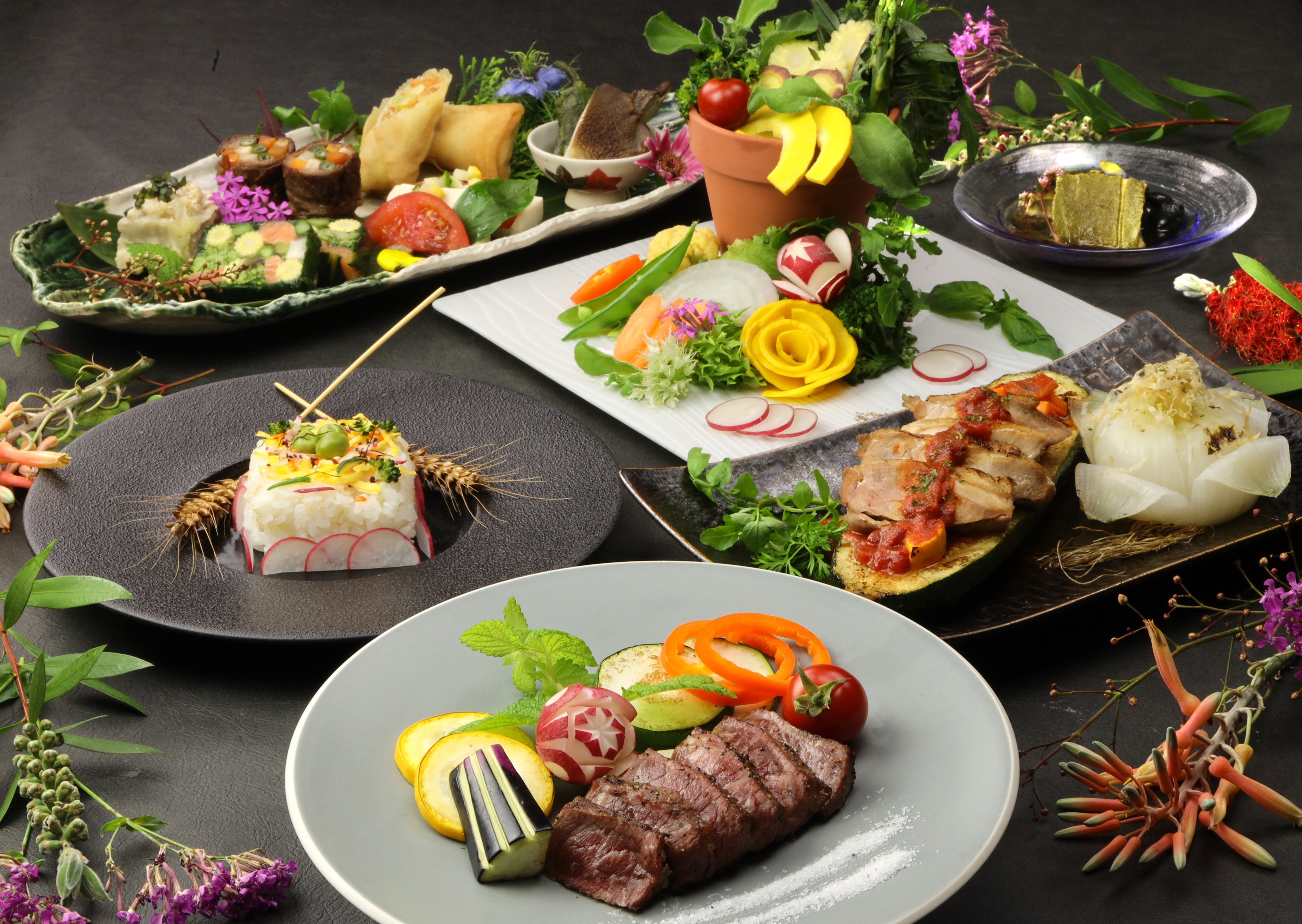 滋賀食肉市場の指定牧場より近江牛枝肉を一頭買いする精肉卸直営の肉割烹店「花殿 ka-den」と、滋賀県認定農家・近江自家栽培ファームと滋賀県内の地元農家より届く鮮度最高の近江野菜が揃う自然派レストラン「花様 ka-you」が融合。