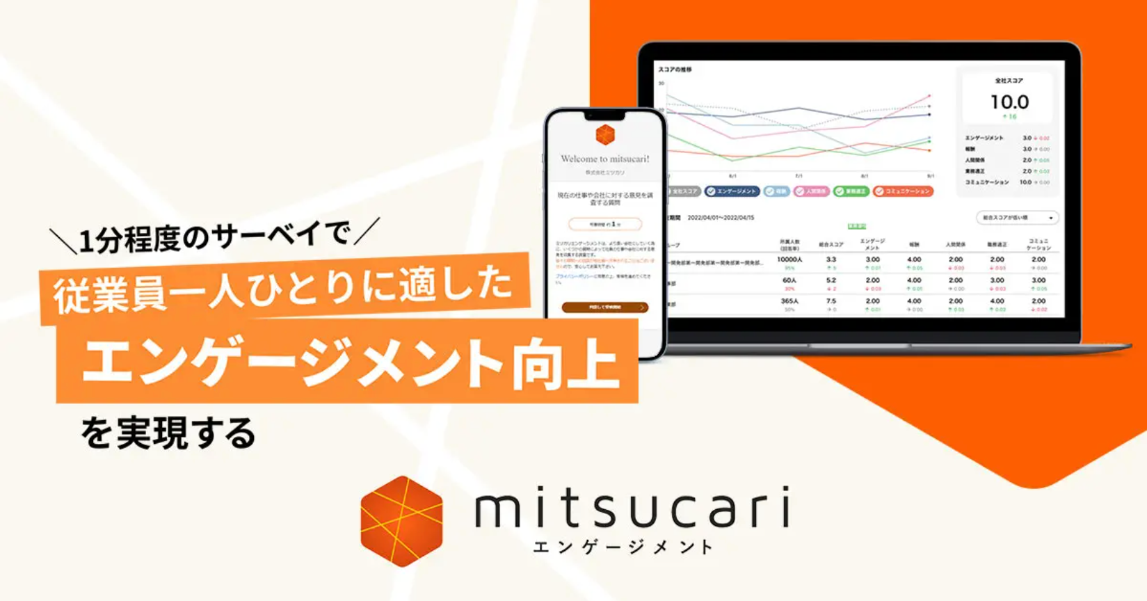 ミツカリエンゲージメントは、従業員の仕事への活力や熱意を高め、人材定着を支援するエンゲージメントサーベイサービスです。