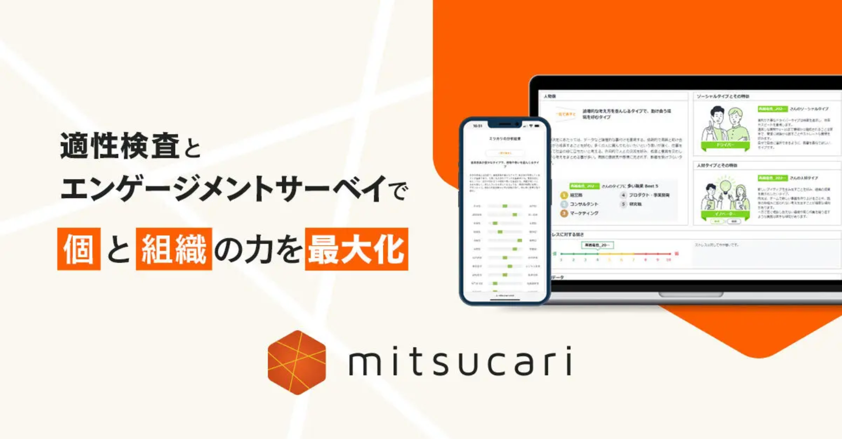 ミツカリは、適性検査とエンゲージメントサーベイを組み合わせ、ひとりひとりの性格・相性を理解して組織の力を最大化するHR Techサービスです。