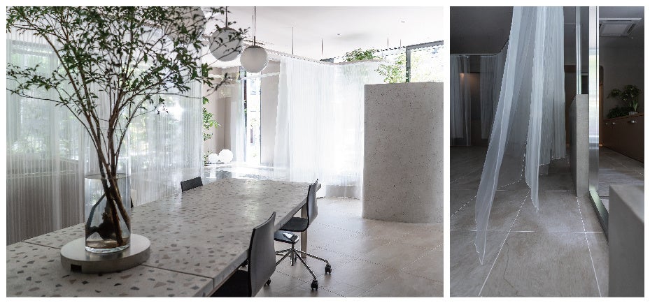 また、ショールームの中心にあるコミュニケーションスペースは、水をイメージしたテクスチャードカーテンで囲われており、大窓からの自然光を取り入れながらも外からの視線を遮り、落ち着いた時間を過ごせる空間に仕立てました。