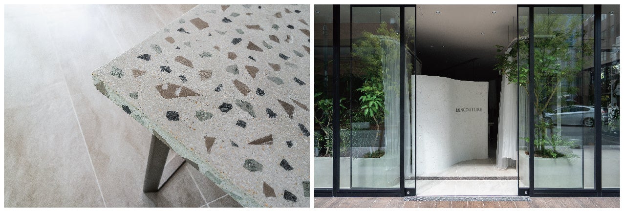 その他、浴室以外のショールーム全体の内装もモダンに仕上げる中で、センターテーブルには、バスルーム製作時に発生した天然石やタイルの廃材を使用し有限資源を活用。また、エントランス部の壁には洋食器メーカーでもあるニッコーの陶磁器事業で実際に使用している食器の原料を使用するなど、ニッコーの取り組みや特徴を感じられる要素も盛り込みました。