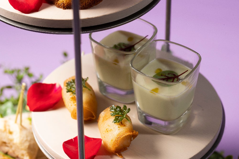 「THE MOON」は、 “天空の森”をコンセプトに東京の絶景を一望しながら食事を楽しめるレストランです。この度スタートするアフタヌーンティーは、六本木ヒルズ森タワーのシルエットと店名「MOON(=月)」をイメージした高さ70cmを超えるスタンドに、有機栽培された膨潤な香りの食用薔薇「さ姫」を贅沢に使用したパフェやマドレーヌなどパティシエこだわりのスイーツ8種と、枝豆のポタージュや帆立のパートブリック包みなど初夏を感じるセイボリー4種を楽しめます。