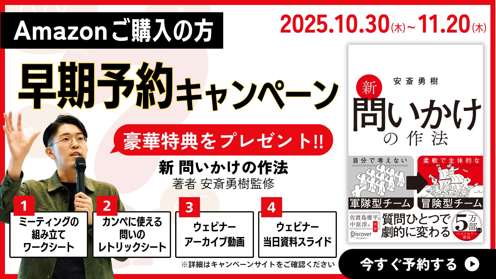 株式会社MIMIGURI(本社:東京都文京区、Co-CEO:ミナベトモミ、安斎勇樹、以下「MIMIGURI」)は、安斎勇樹の改訂新版『新 問いかけの作法』の2025年11月21日(金)より順次発売開始を記念して、本日10月30日から11月20日までの期間限定でAmazon早期予約キャンペーンを開始いたします。