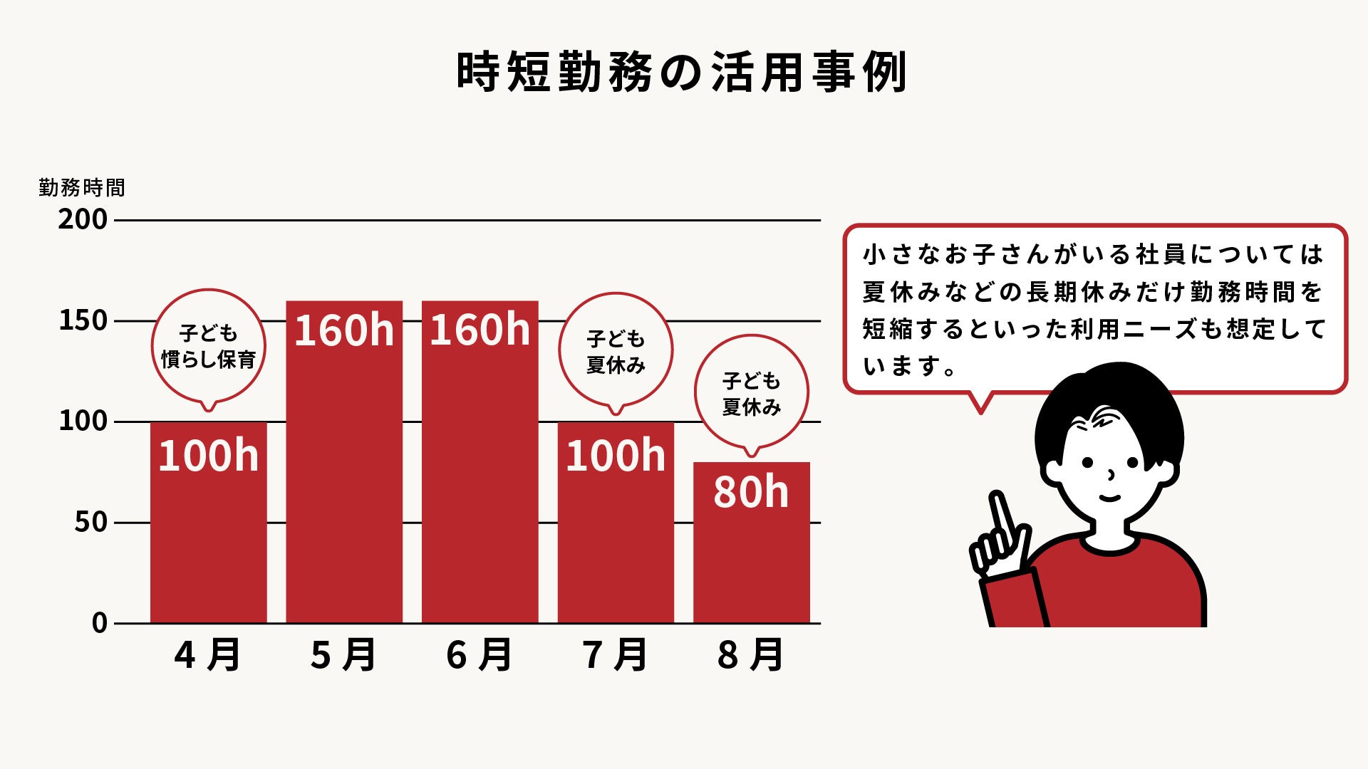 本制度を利用すれば、1日4時間×週5日勤務や、1日8時間×週2-3日勤務といった、育児の都合に合わせた働き方を社員個人が自由にアレンジすることができます。そのため、月間80時間勤務で正社員として活動することも可能になりました。小さなお子さんがいる社員については、夏休みなどの長期休みだけ勤務時間を短縮するといった利用ニーズも想定しています。
