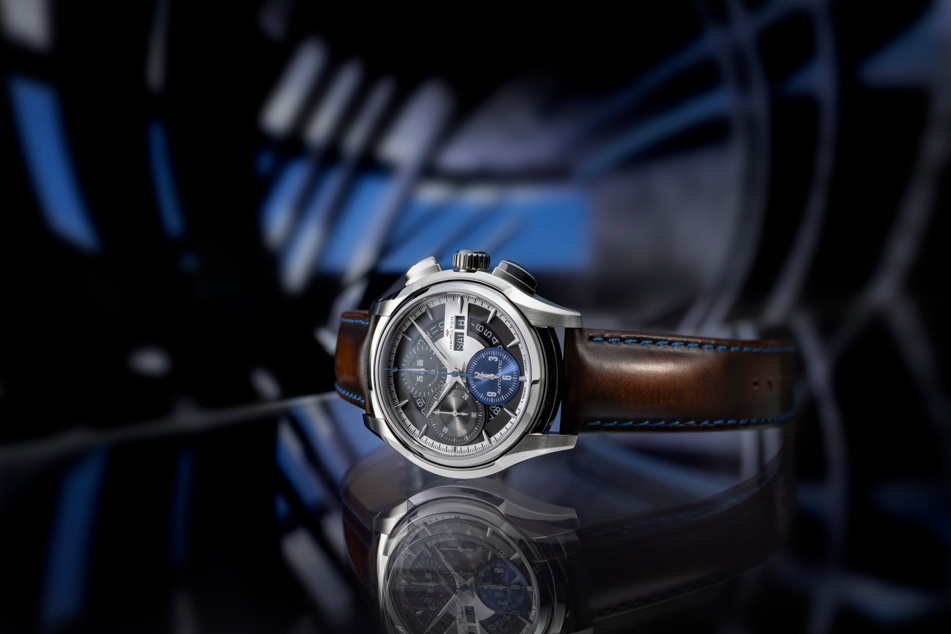外側のリングは時刻を表示し、3つのクロノグラフカウンターは時・分・秒の経過を計測します。重なり合うサブダイヤルの下には日付表示のホイールを配置し、立体的な構造を生み出しています。二重型というコンセプトは、ダイヤルを構成するアンスラサイト、そしてアワーカウンターと表裏を貫通する秒針のブルーのアクセントにも表現されています。